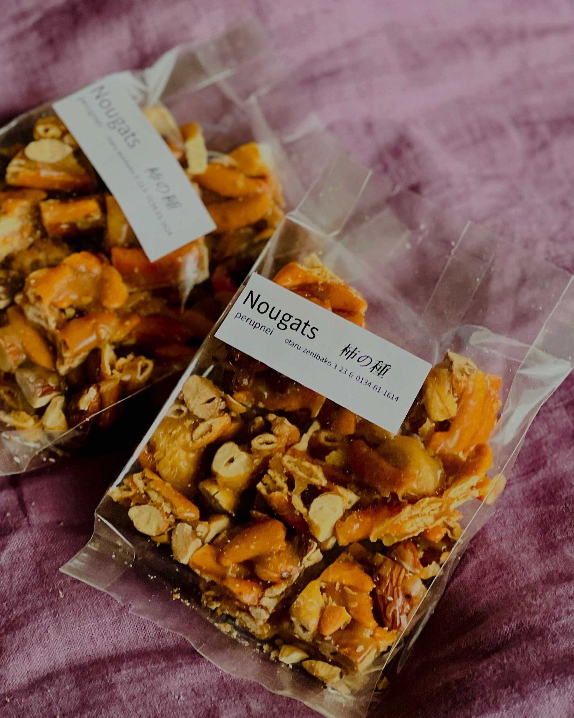 アーモンドにおしょう油入りの砂糖の衣をからめました。お友達からヒントをもらって試作を始めたのですが、この菓子が試作で一番難航しました。このパックの中には醤油の種類を変えて作った二種類がミックスされています。ひとつは、「再仕込み醤油」という大豆にお水でなく、完成した醤油を加えて仕込む、旨味強く色の濃い醤油を使ったもの。もう一種類は比較用に一般的な酸化を防ぐパッケージの醤油を使ったものを作ってみました。食べ比べてみると、一般的な醤油のほうが、醬油の味わいがすっきりクリアで砂糖のコクというか旨味が出ていて美味しかったんですよ。びっくり!なので今後の製品化については一般的な醤油で作りますので、再仕込み醤油で作ったものはもう出ません。ちなみに再仕込み醤油で作る前提で試作していたので、このパックの中身はほとんどが再仕込み醤油を使ったもので、糖衣が薄茶色のものになりまして、厳密にいうと醤油の量が多めと少な目の二種類に、白っぽい一般的な醤油のものが少し入っています。再仕込み醤油はお刺身に使ったするとても美味しい醤油なんですが、一般的な醤油は酸化を防ぐパッケージのせいでフレッシュ感が強いのか、醤油の切れ味で砂糖のコクが引き出されたなという印象で、作ってみないとわからないものだなあと驚きました。ただ、再仕込み醬油バージョンは商品化できるだけ十分に美味しく仕上がってはいるので、今回のセットに入れております。安心してくださいね。