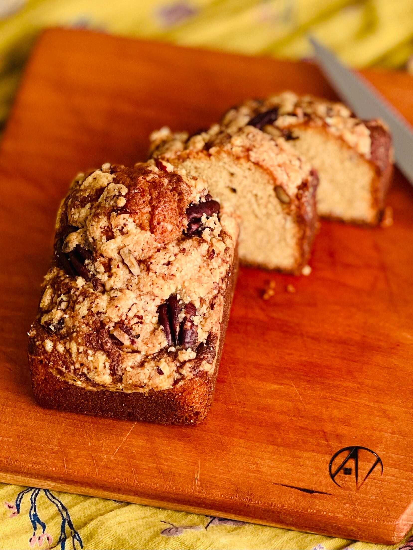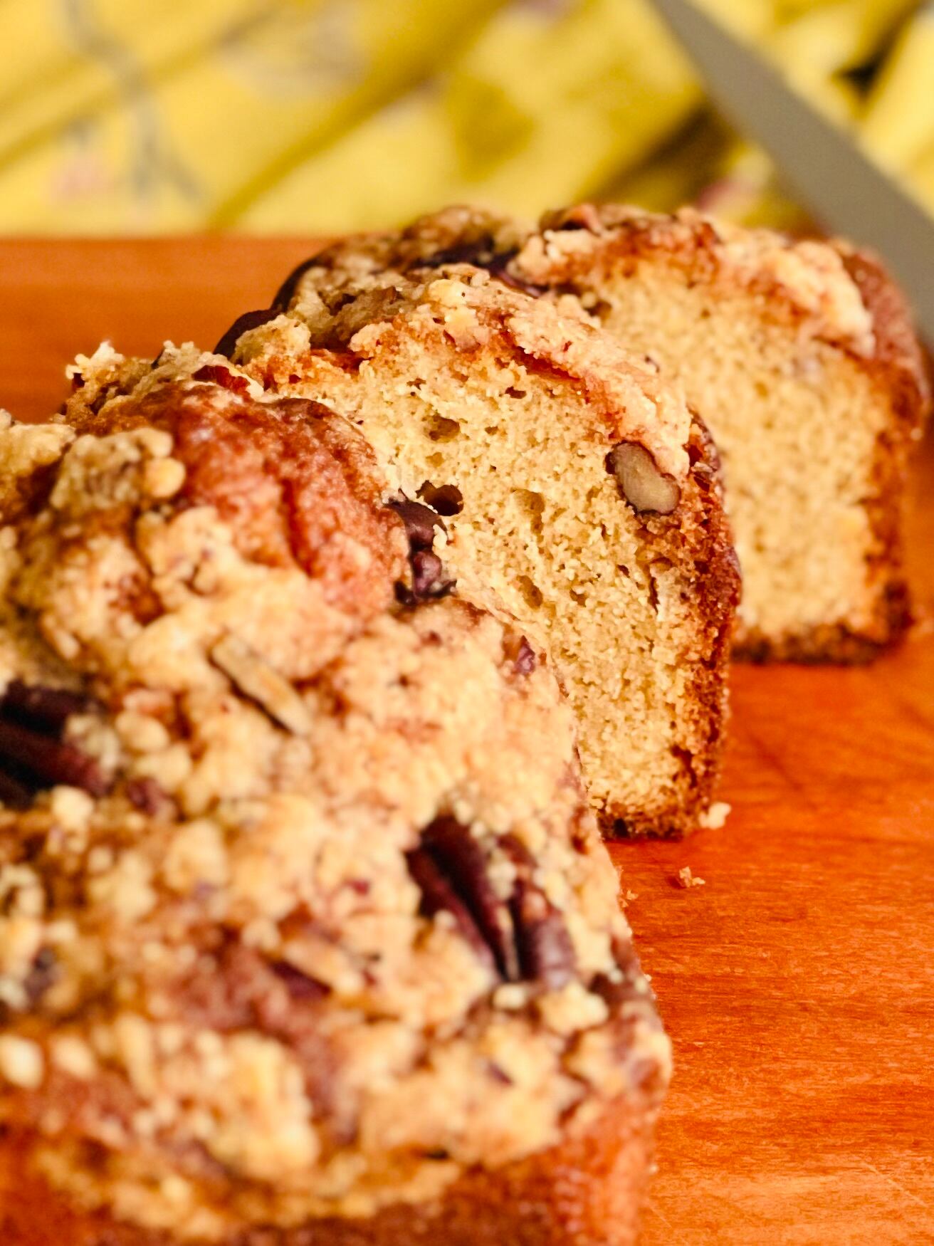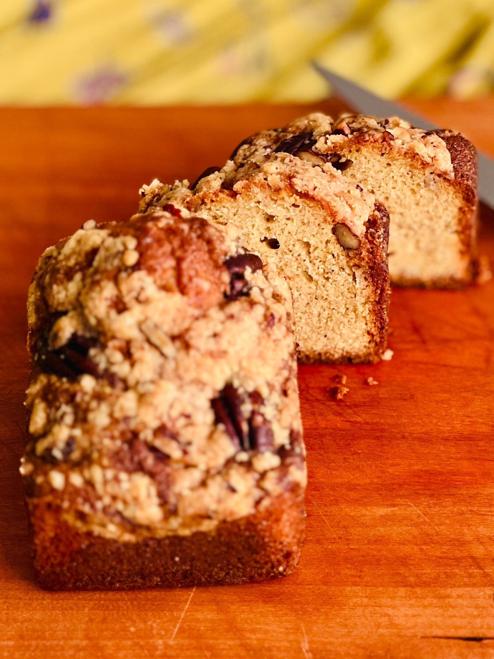 今回のスパイスケーキには、シナモン、ジンジャー、ナツメグのエキゾチックな香りをまとわせました。それから、ペカンナッツをたっぷり使いました。刻んだペカンは生地と、ケーキトップのクランブルに、それだけでは足りませんね!トップにはクランブルだけでなくペカンのホールも散らしました。カットのケーキでは見られないケーキのトップの風景も愉しんでくださいね。お酒のつまみなら、コンフィチュールをラムかブランデーで伸ばしてソースとしてお皿の端にちょんとのせてスプーンの背で引いてみるのはどうでしょうか。お砂糖を控えたホイップクリームにブラックペッパーを振って添えるのもよいと思います。