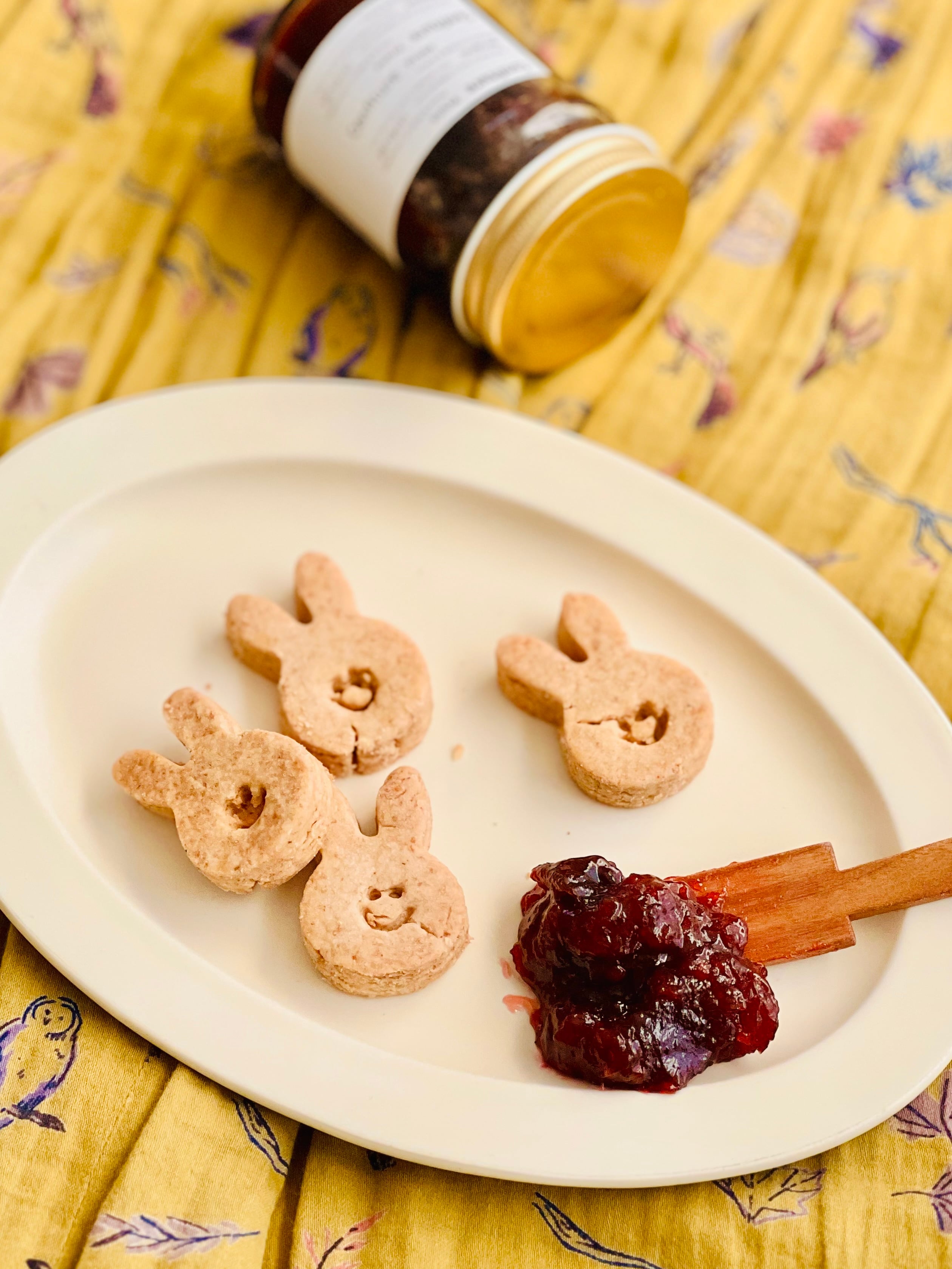 今まで同様に生地はざっくりした粗い食感と厚みはそのままに、少し小麦粉寄りの生地を作って、大きいのが1個よりゆっくり食べてもらえるかなと、小さなうさぎの型で抜いて焼きあげました。ファンシーかな?でもなんとなくほっこりしませんか、笑 北海道産の全粒粉を使いました。粉の香りを感じてもらえたら嬉しいです。コンフィチュールを添えてお召し上がりくださいませ。
