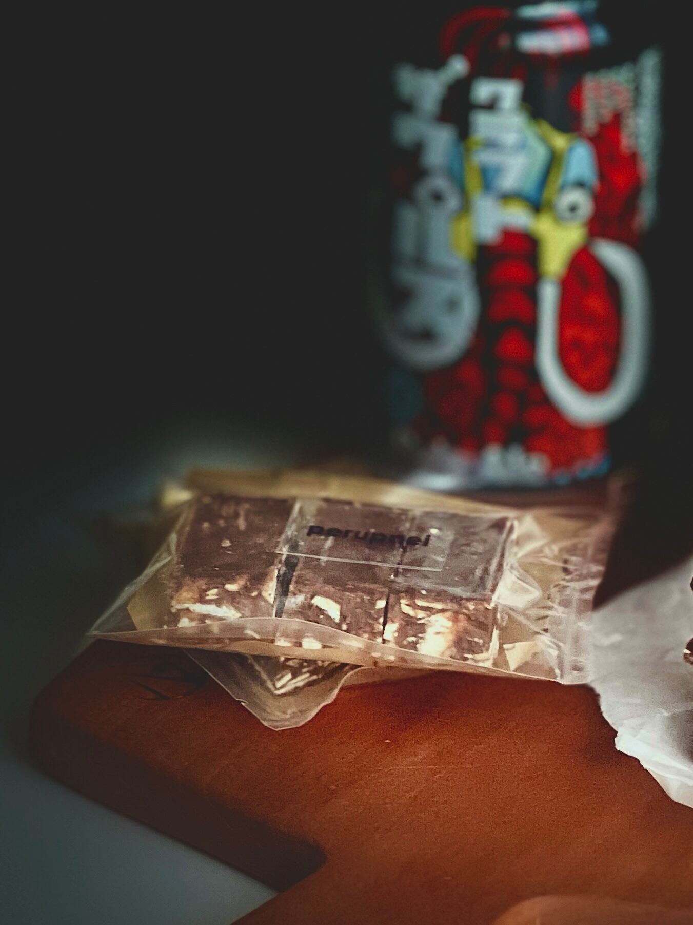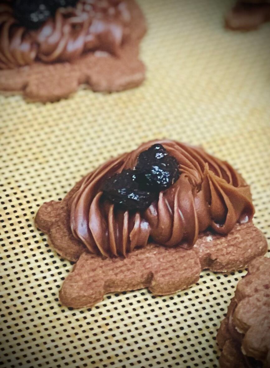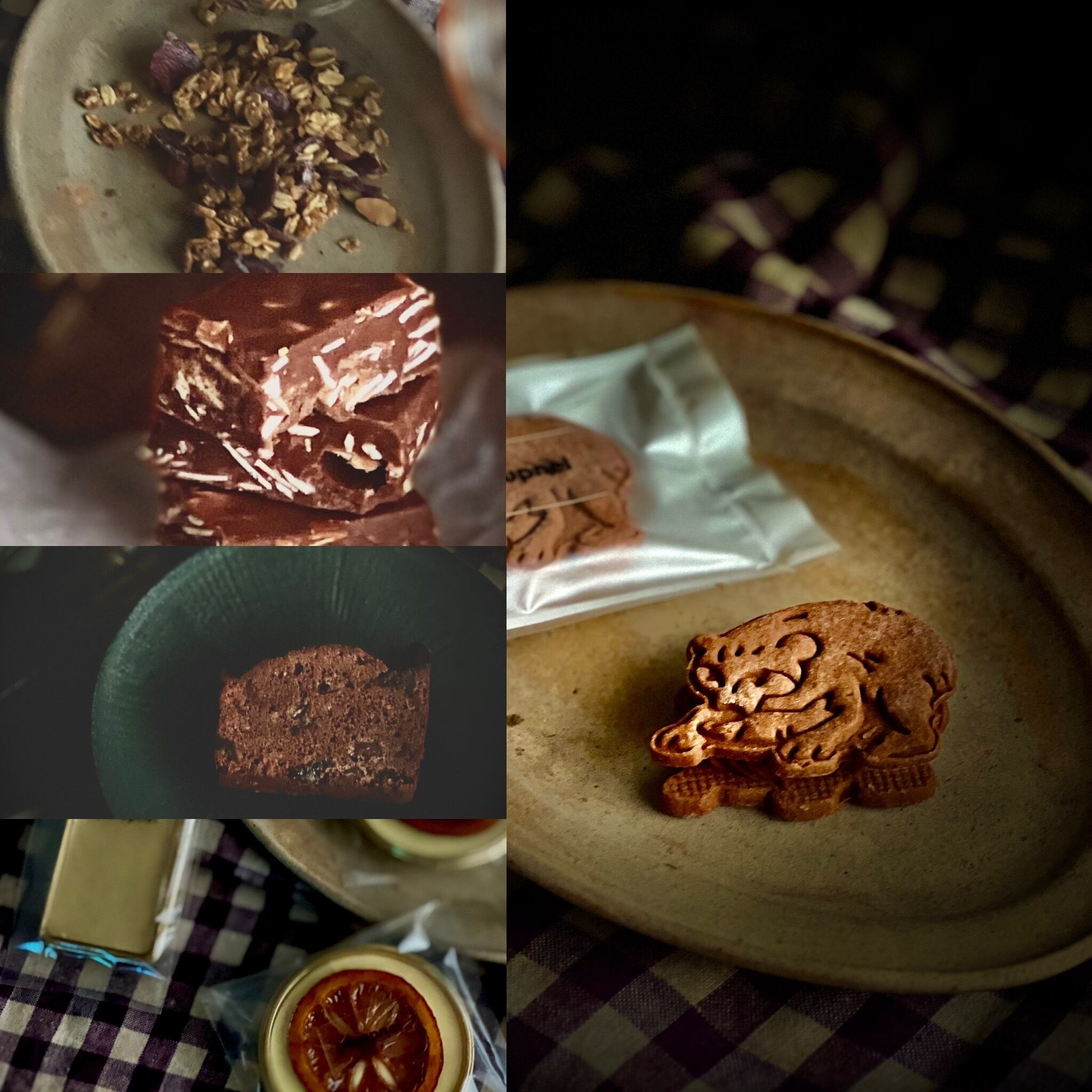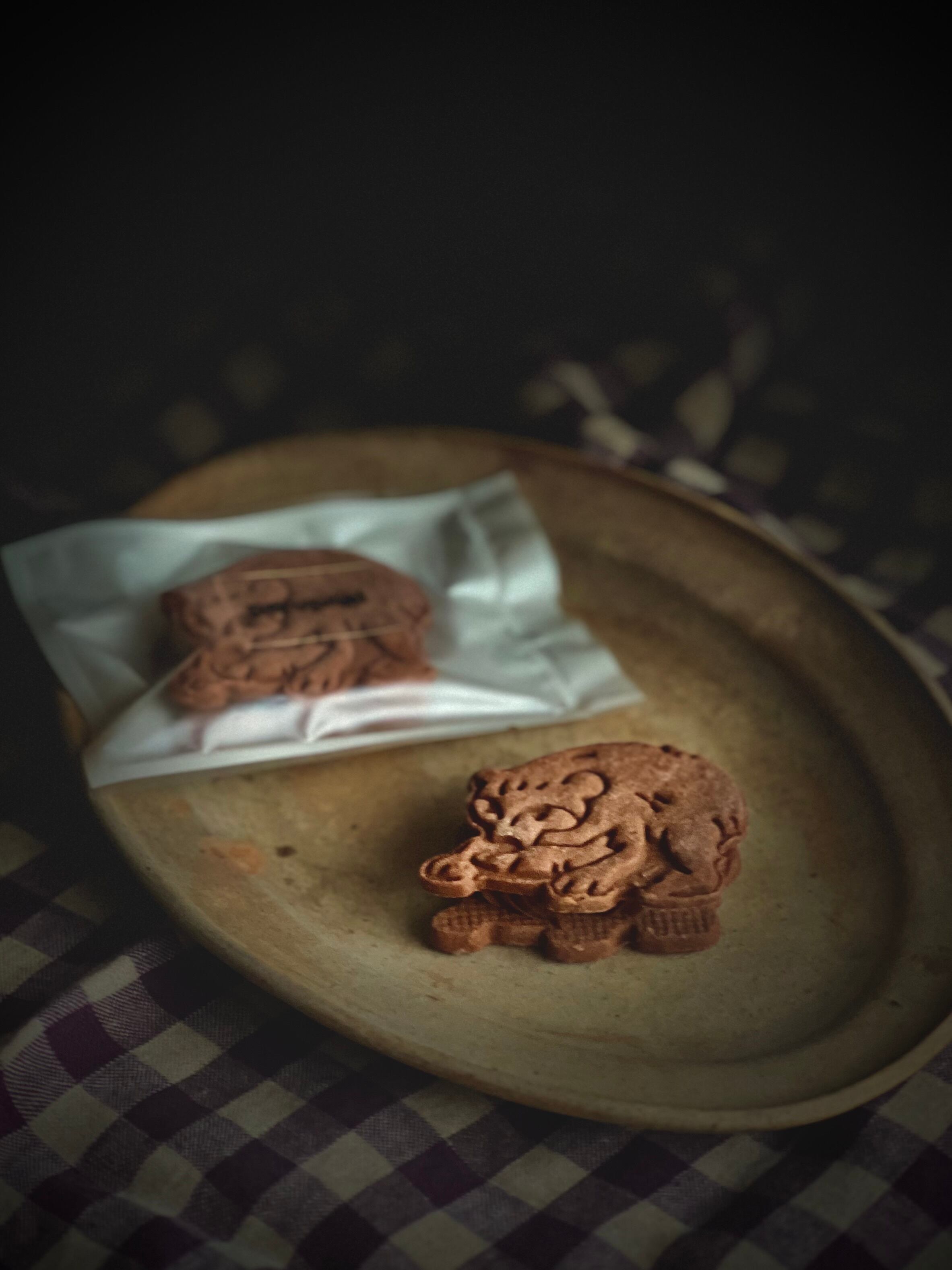木彫りくまのクッキーをチョコの生地で焼いたらもっとそれっぽいかもとずっと思っていて、ついにその野望をかなえました!「ラクテ」という濃厚なミルクチョコレートのガナッシュををたっぷりとクッキーに絞りだして、自家製のラムがシミシミのレーズンと一緒にサンドしました。やっぱりラムが合うと思いますが、熟成した日本酒のお燗やデザートワインなどの濃厚な甘味のあるお酒に合うと思います。
