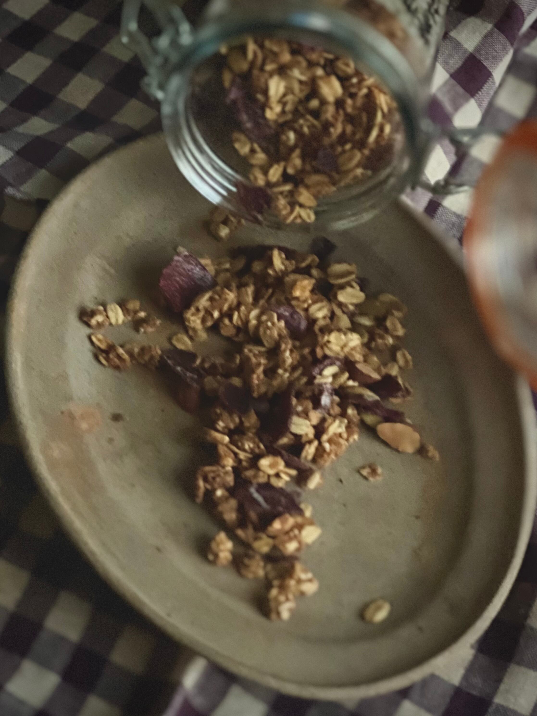 これだけショコラじゃないですが、ホットミルクでせひ寒い朝のお食事にお召し上がりください。今年はむらさき芋のチップスで色鮮やかに作りました。おいもを焼いて、自家製のジンジャーシロップで伸ばして柔らかいペーストをまとわせて焼いたグラノーラです。おいもの美味しさがミルクに溶け出して美味しいですよ。