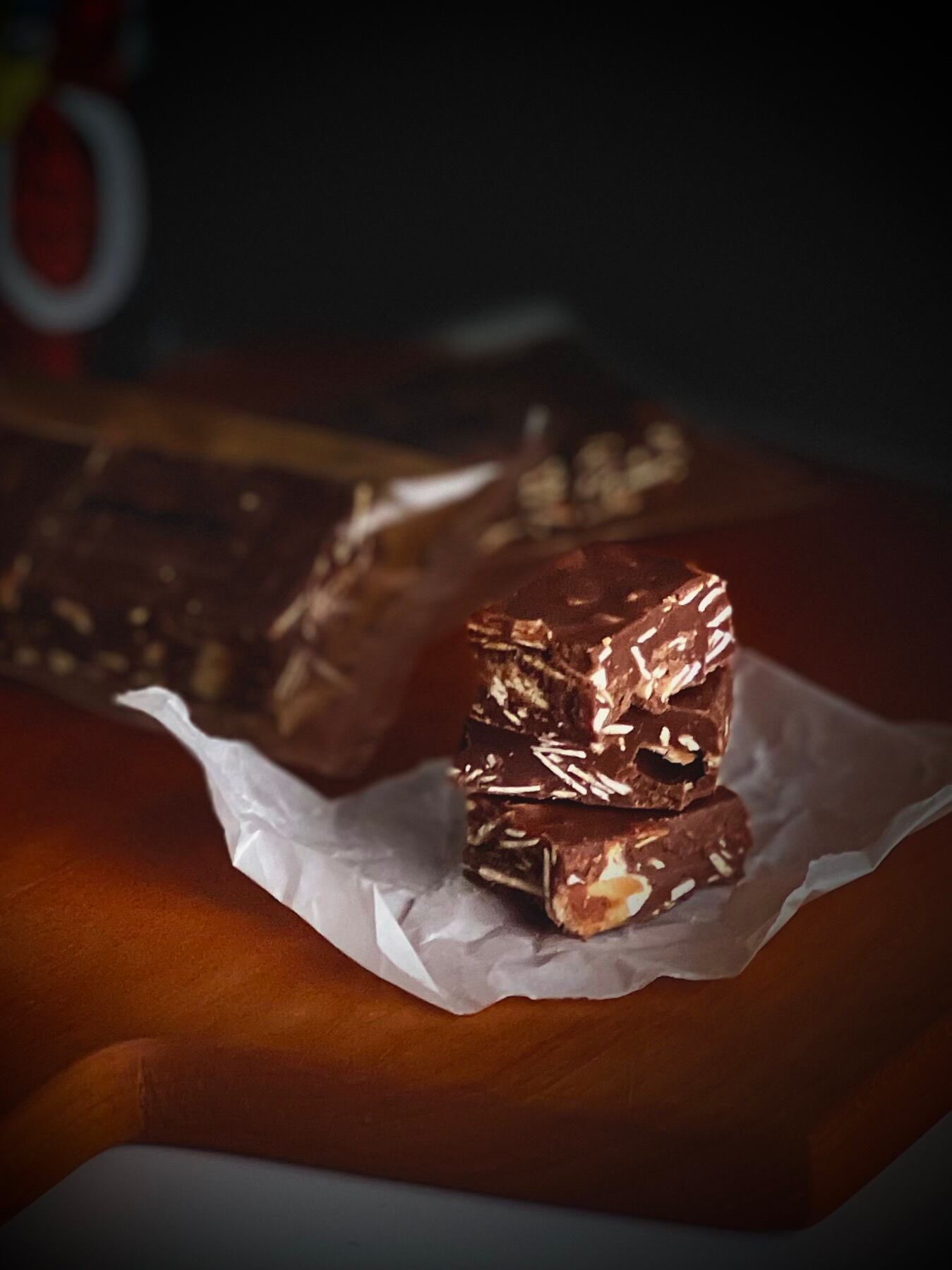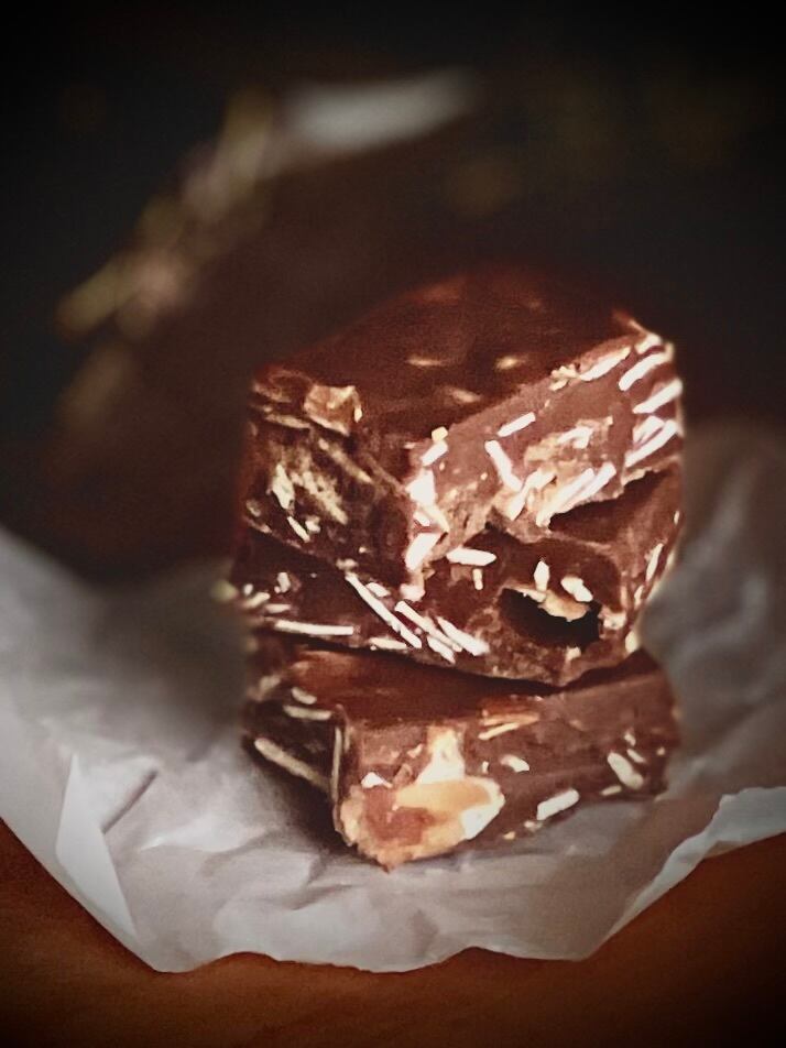 こちらは甘味強めのベルギー産のミルクチョコに、同じベルギーのブラックチョコレートを少しブレンドして味わいを整えたチョコにクランチのピーナツバターを加えて濃厚な味わいに仕上げました。お口の中でとろりと溶け出すチョコにスライスアーモンドのパリパリした食感が楽しいですよ。ちょっと甘味があって濃厚なスタウトビール(黒ビール)とか、甘口寄りのシェリーなんかに合うと思います。