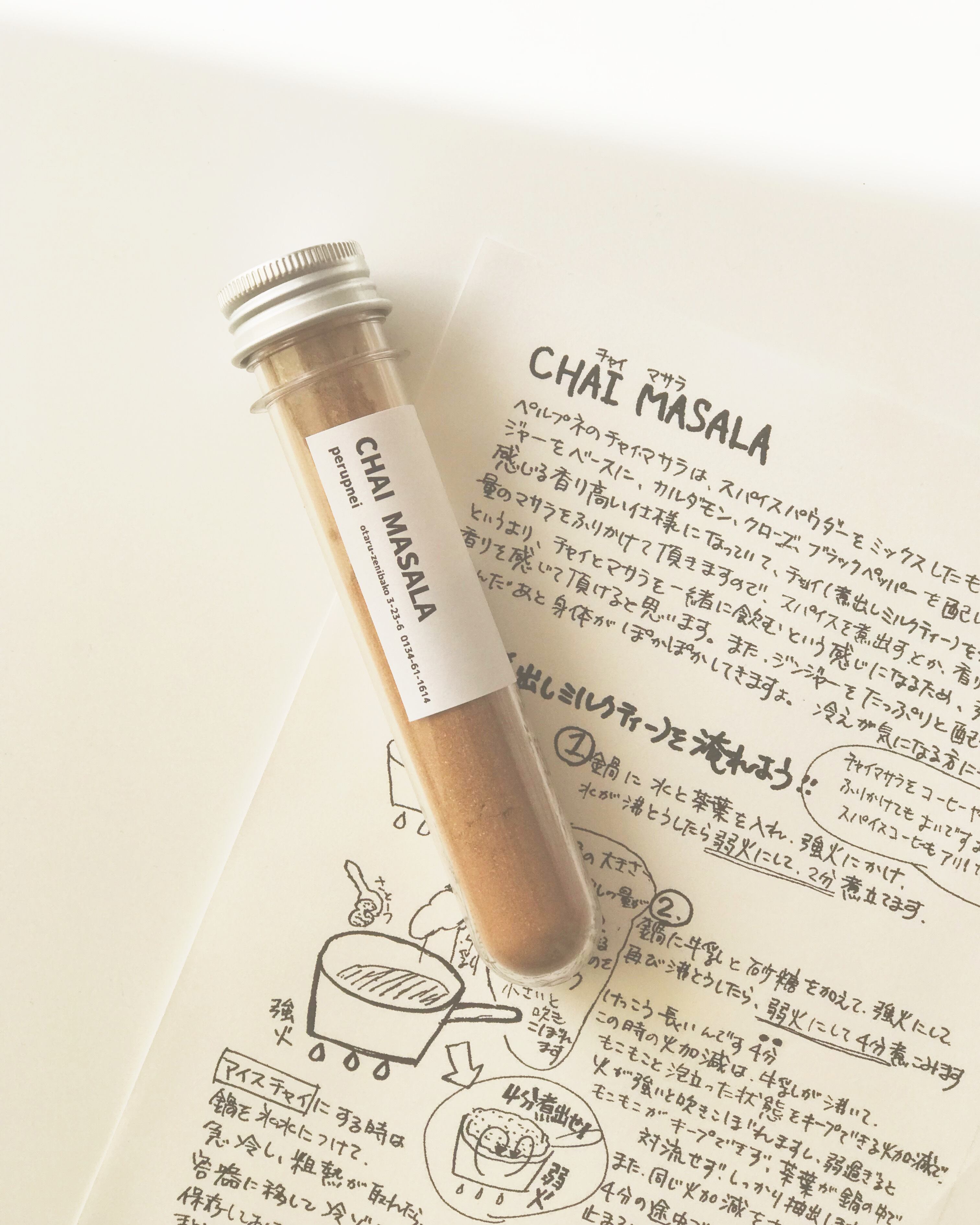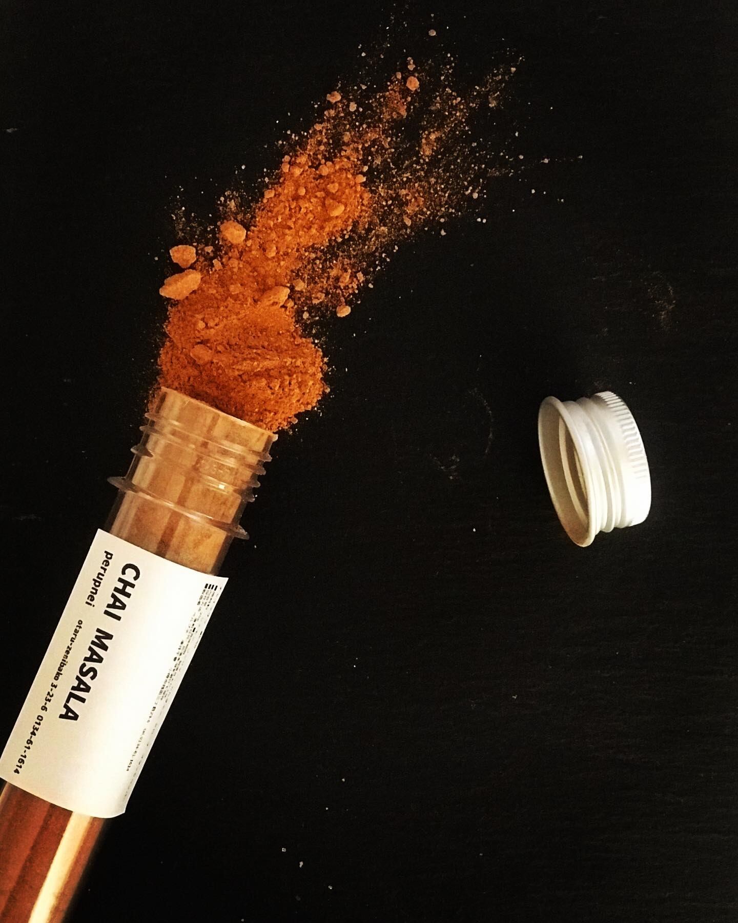 チャイってなんでしょう? カフェに入ってメニューにあったらオーダーしちゃうやつそれが「チャイ」、正しくは「マサラ・チャイ」。ややこしいのですが「チャイ」というのはインド風の濃く煮出したミルクティーのことで、そこにチャイ用のミックススパイスを加えると「マサラ・チャイ」となりますが、日本では「チャイ」と行った時は「マサラ・チャイ」を指してますよね。そして、このチャイ用のミックススパイスのことを「チャイ・マサラ」といいます。ペルプネの「チャイ・マサラ」はシナモン、ジンジャーをベースにカルダモン、クローブ、ブラックペッパーを配したパウダータイプのマサラです。ジンジャーがかなり多いので、やや辛味を感じる配合ですが、飲んだ後は身体がぽかぽか温まります。
