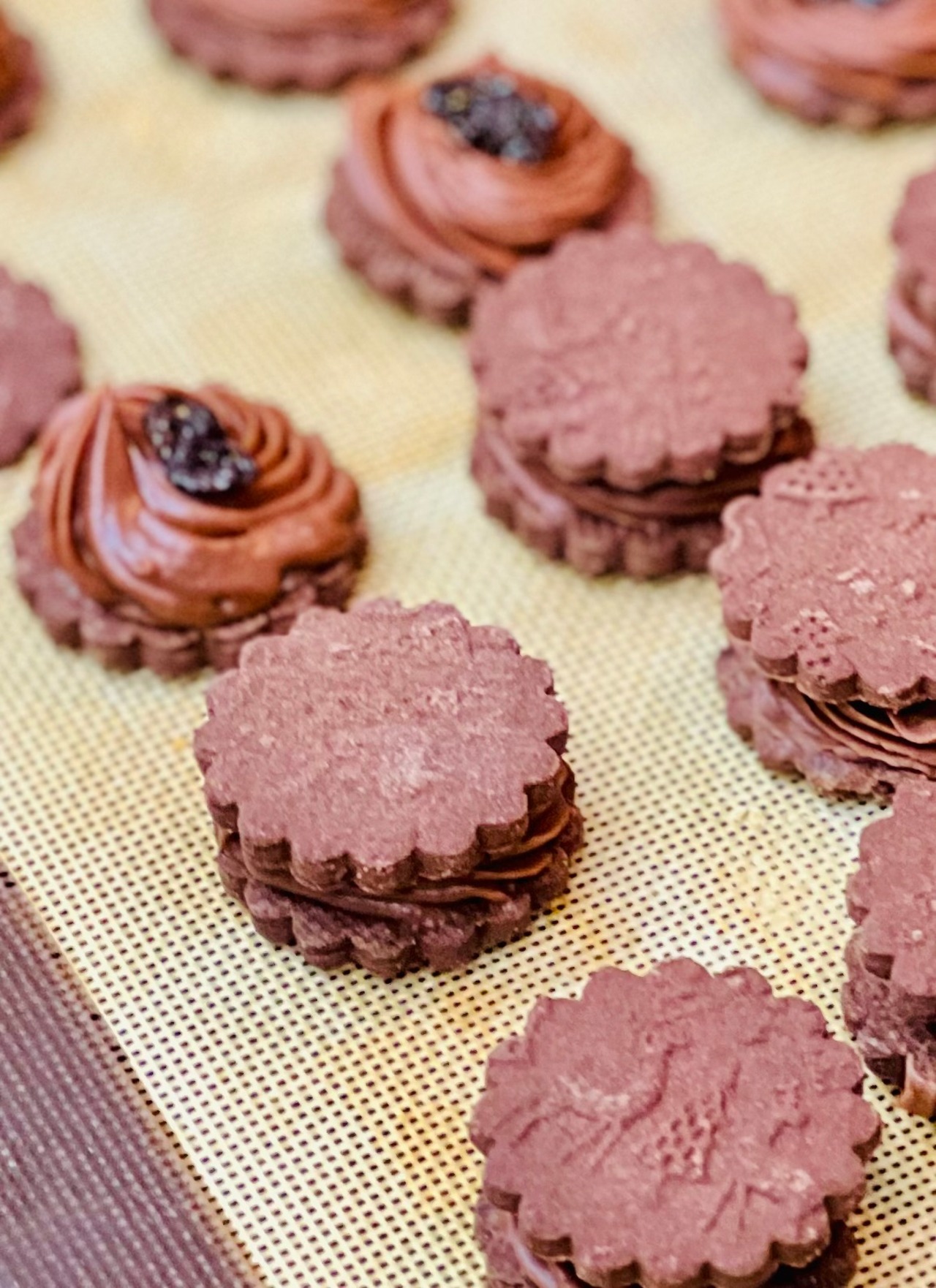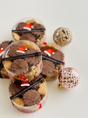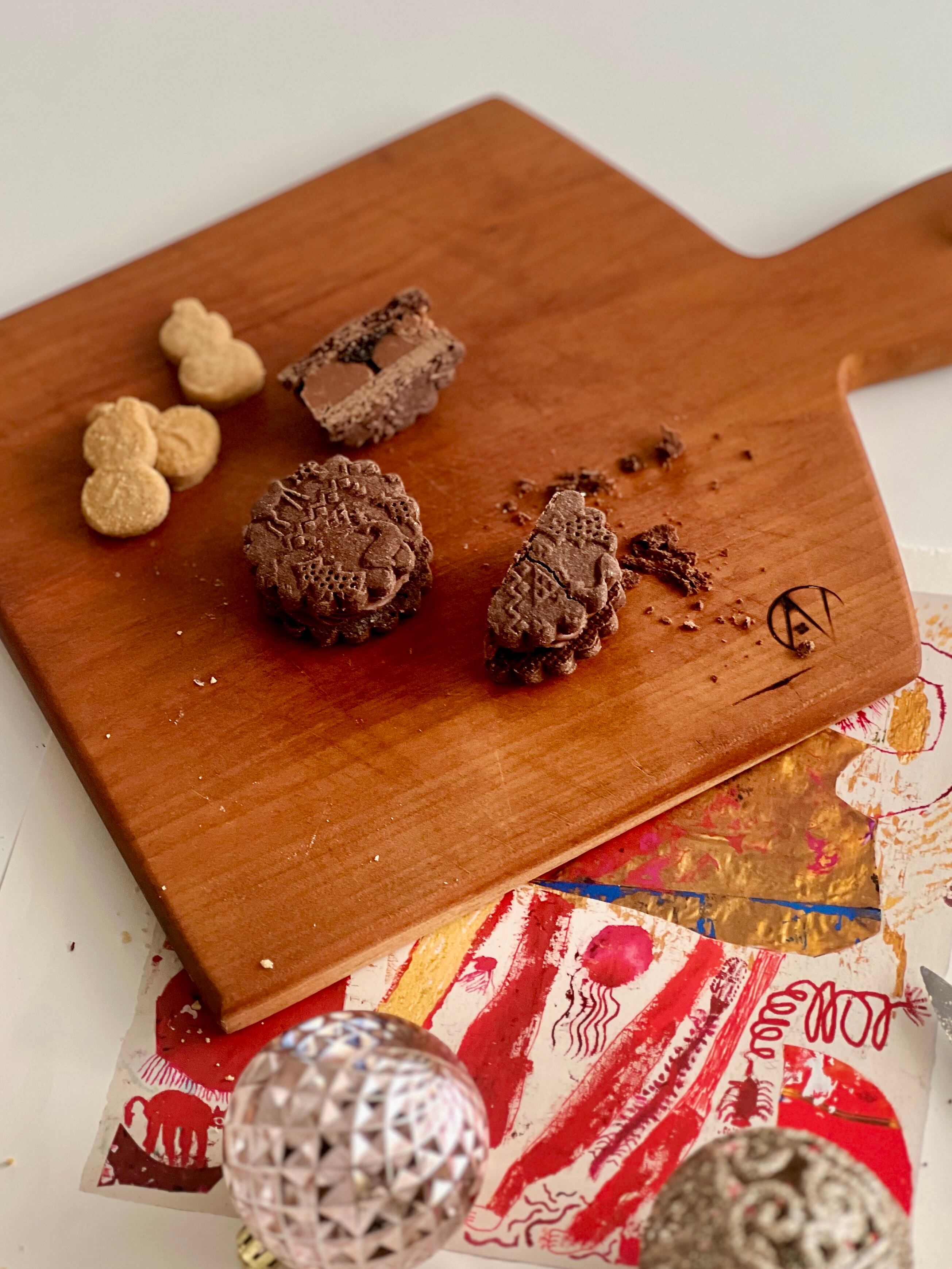 冬の模様のココアクッキーにミルクチョコにラムの香りをまとわせたガナッシュとラムレーズンをサンドしました。ガナッシュが溶けやすいので、涼しい場所か冷蔵庫に保管してください。そして食べるときに少しの時間常温においてチョコを柔らかくもどしてお召し上がりくださいませ。