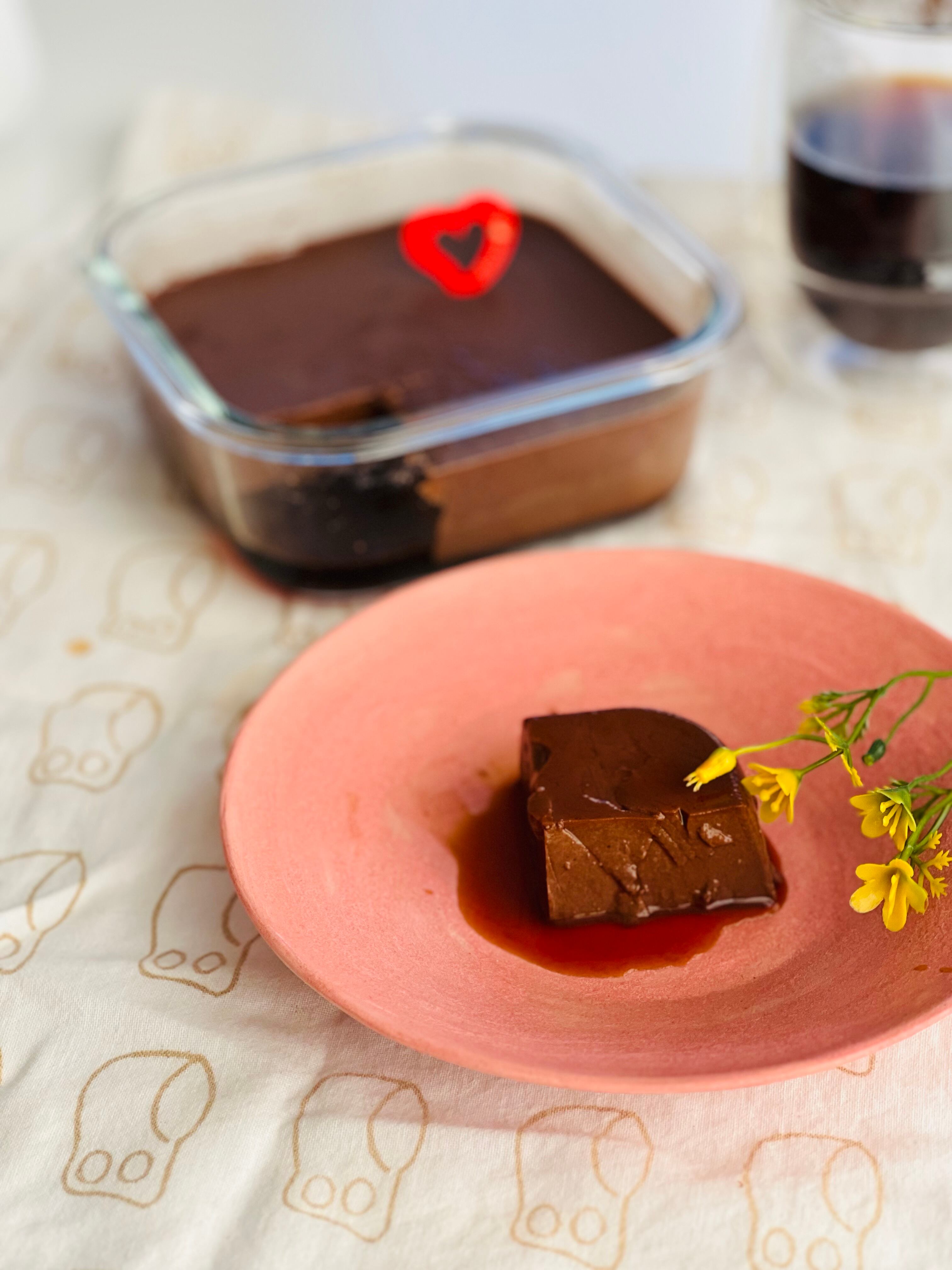 チョコレートプリンはクーベルチュールスイートチョコレートをたっぷりと生地に溶かし込んで焼き上げています。カラメルはノーマルなものを使いプリンの生地にラムではなくグランマニエを加えて香りづけしています。