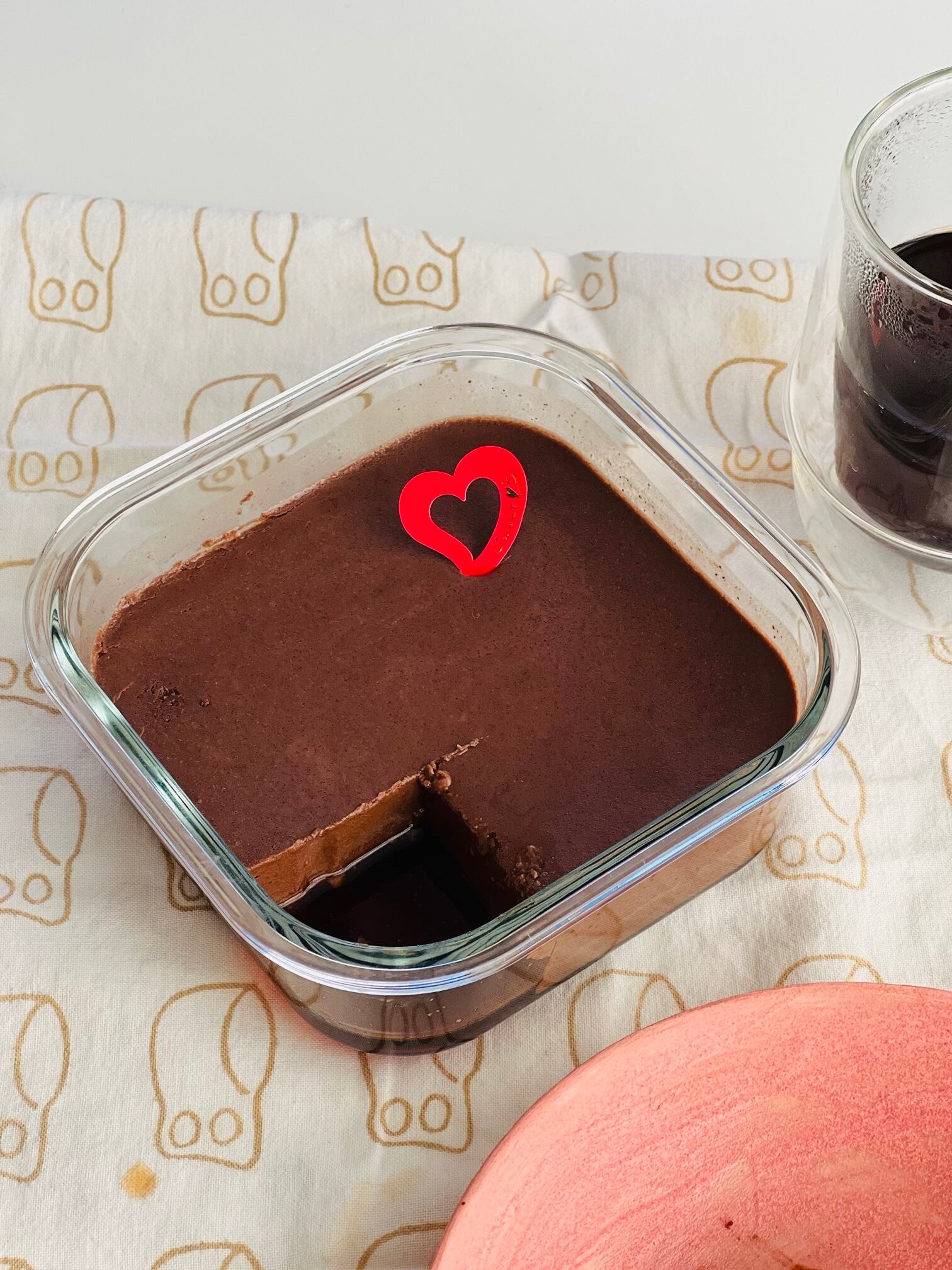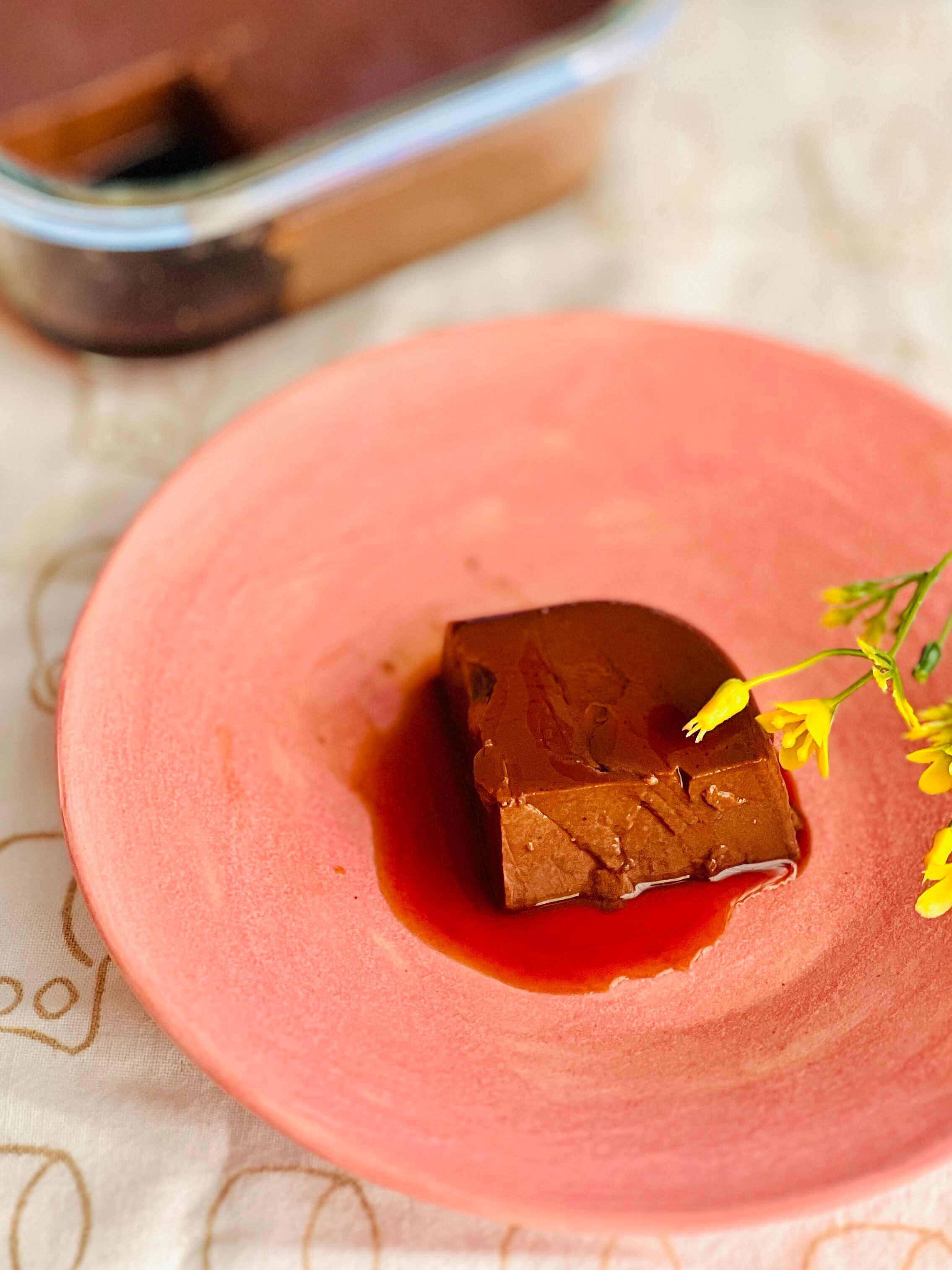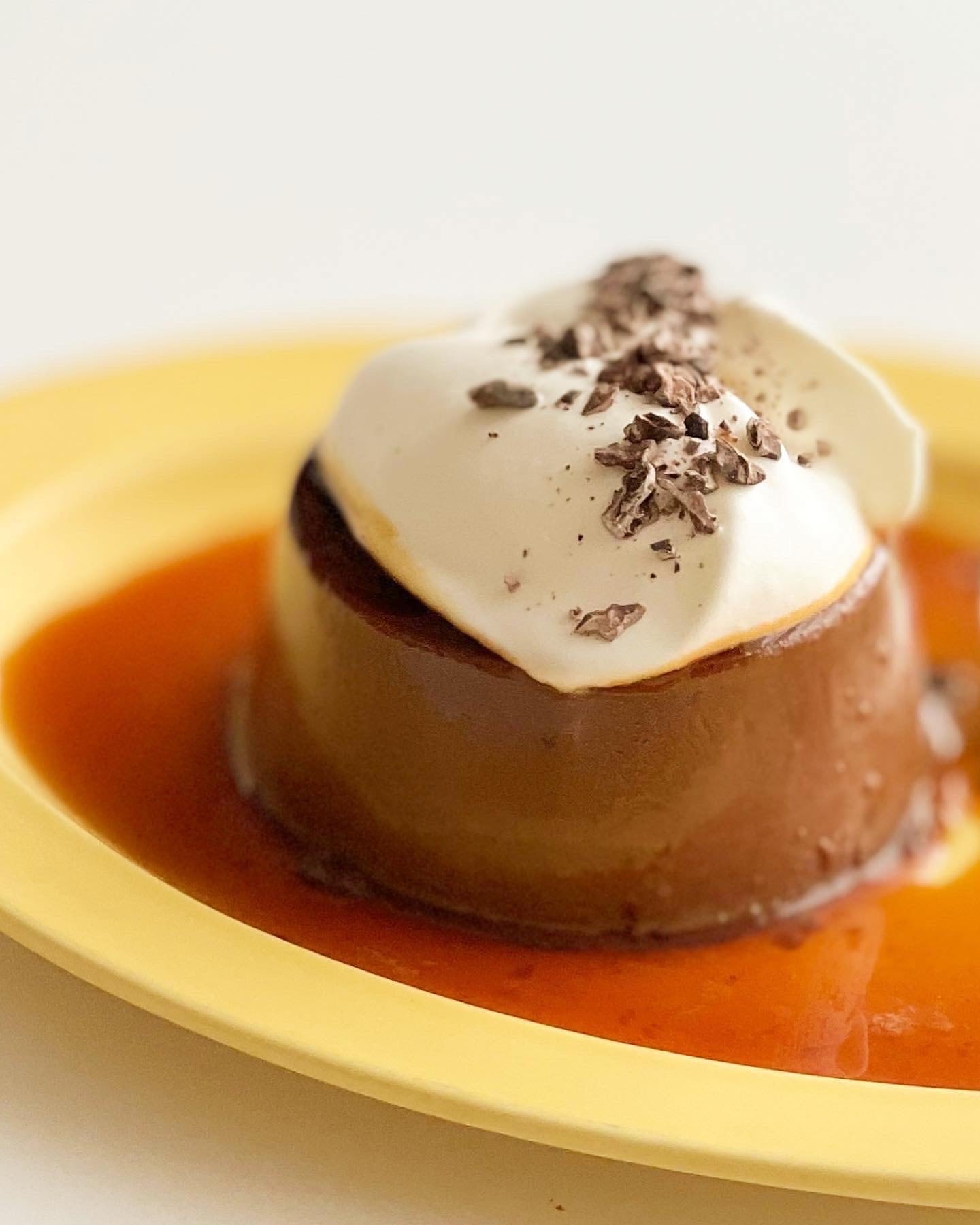 チョコの風味とオレンジの香りを楽しんでいただくのがよろしいと思いますが、もう少し華やかさを演出したい向きにはお砂糖を控えめにして硬めに泡立てた生クリームを添えて軽くココアを振るといいですよ。写真は小さな型で焼いたプリンにホイップクリームをのせて、カカオニブを振ったものです。