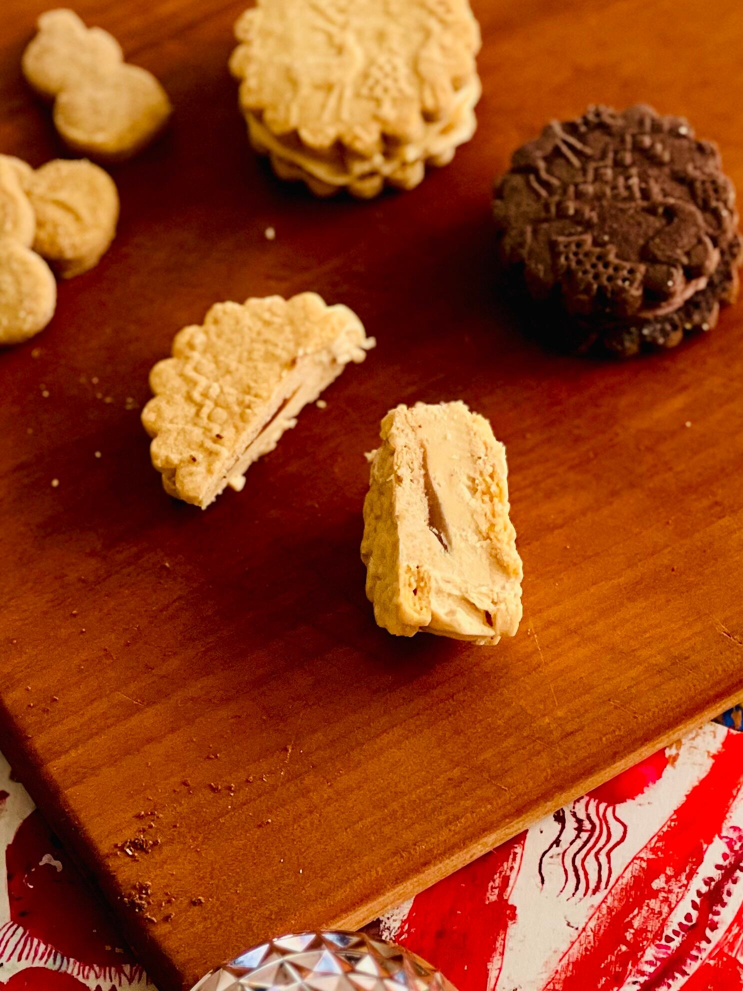 冬模様のアーモンドクッキーにバターとペルプネの「塩キャラメルバタークリーム」を合わせてホイップした、キャラメルバターを絞って、中心に「塩キャラメルバタークリーム」を詰めました。もう説明炒らないですよね。とろけてくださいね。バタークリームも溶けやすいので涼しい場所か冷蔵庫に保管してください。そいして食べる前にしばらく常温においてバタークリームを柔らかくしてからお召し上がりくださいませ。