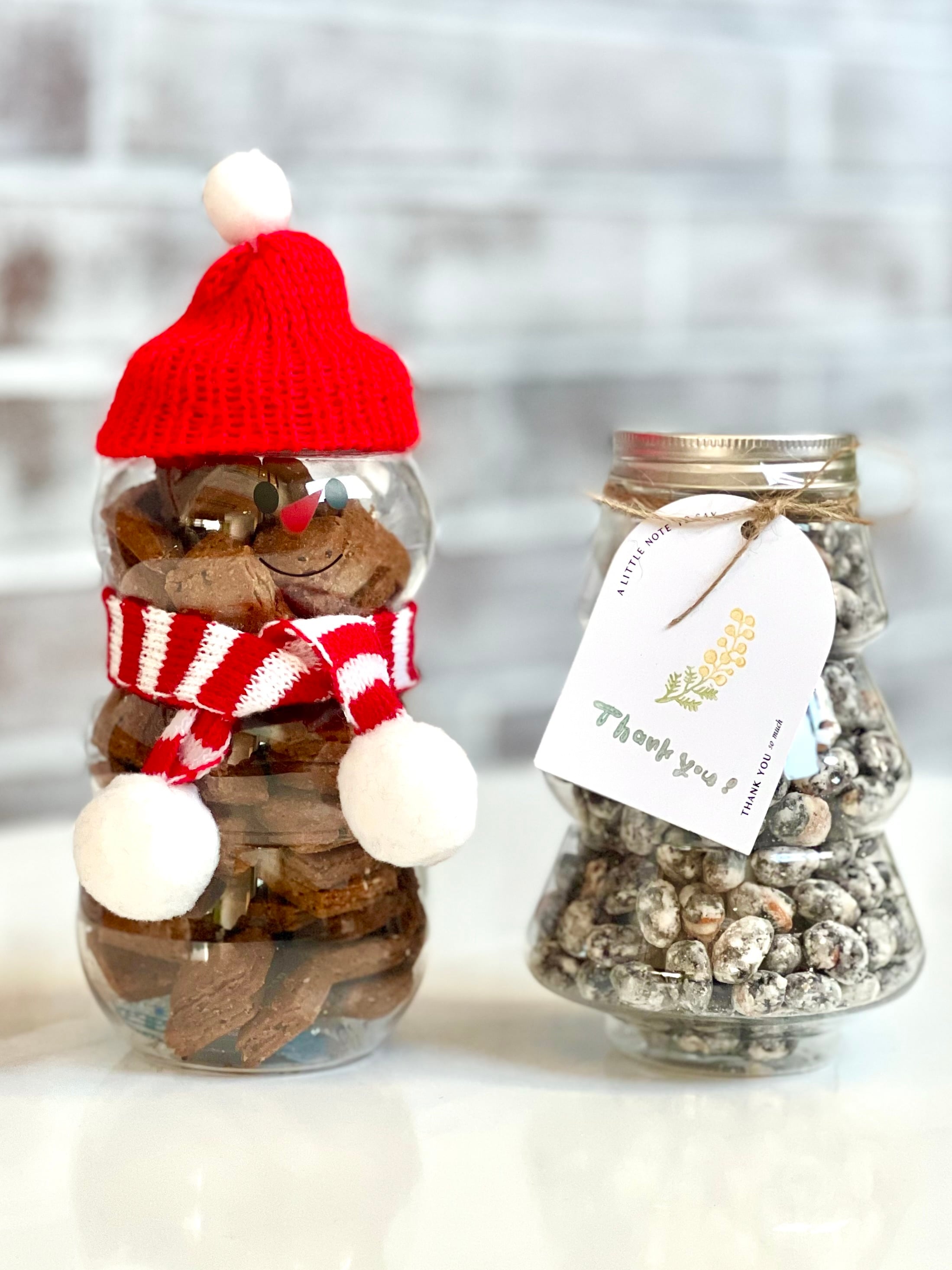 黒豆のきな粉と黒ごまのビスケ。北海道産の黒豆のきな粉がたっぷり入っているので、優しい甘みがあって口解けがいいんですよね。よく噛んでいるとさらに大豆の旨味がでてきて、黒ごまがプチプチと香ばしくはじけてきます。黒々ちゃんは滋味深くて、いつまでも食べていたくなっちゃうので、今年は180gたっぷり容器に詰めたうえに、少し薄く焼きました。薄い分、個数が多く入っていますからたくさんお口に運べますよ。楽しい帽子をかぶってマフラーをまいた雪だるまの容器入れました。PET容器なので丈夫です、食べた後も再利用してくださいね!