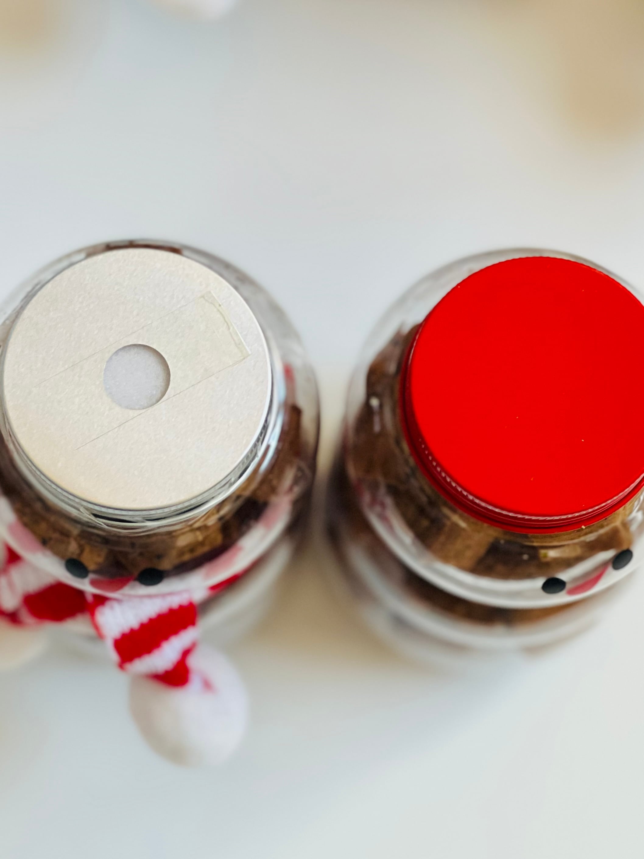 赤いふたとグレーに穴あきのふた2種がございます。穴あきの方はドリンク用のキャップで、弱い力でこの穴にストローを差しこんで、ドリンクボトルとしておつかいいただくことができます。お菓子を入れておりますので、どちらもキャップの周りに防湿テープを巻いてありますが、穴あきキャップの方は穴の上にもテープを張り付けて防湿しております。