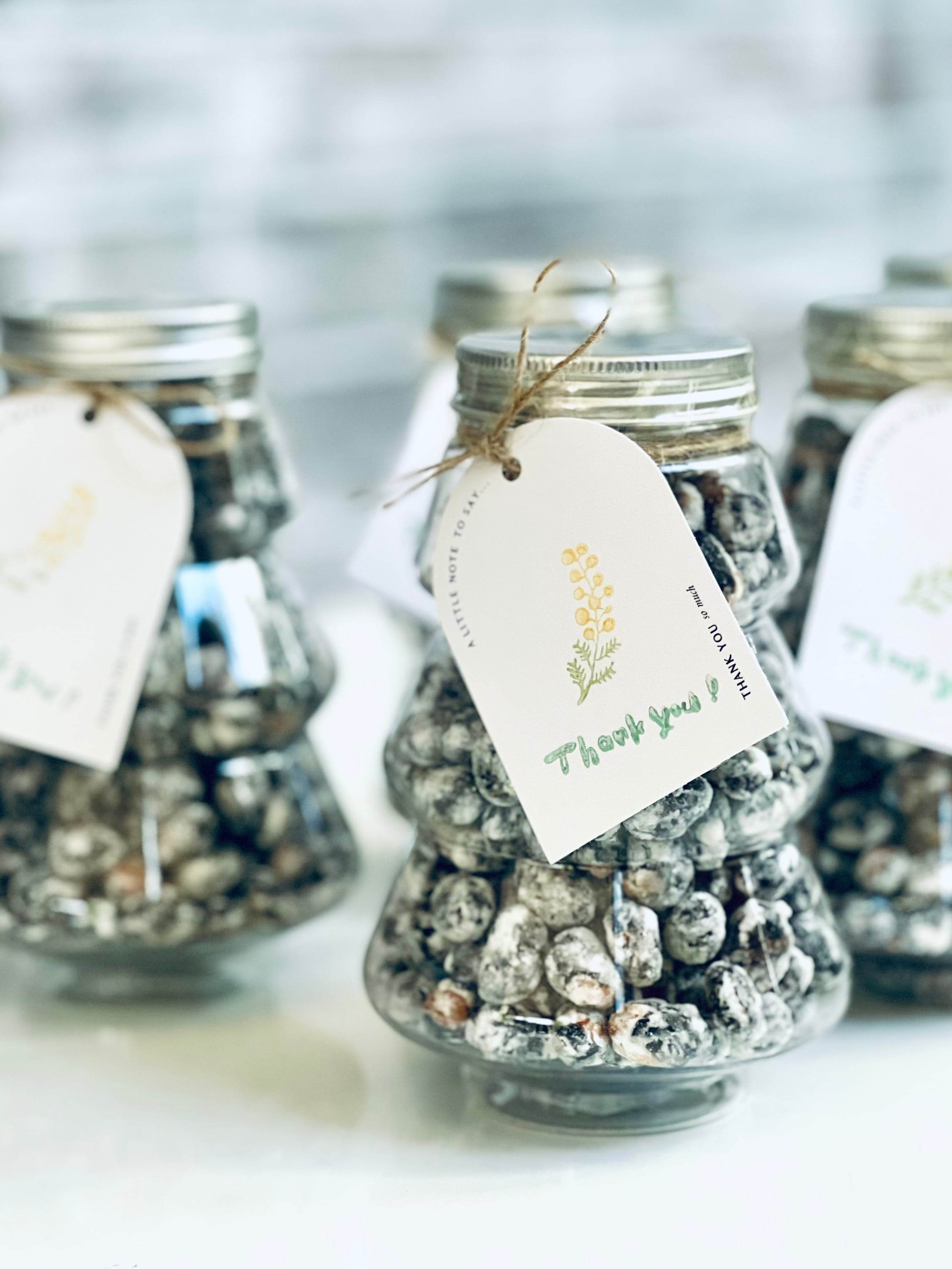 北海道十勝産の黒豆さんを浸水させてふっくらと戻してから焼いた豆にお砂糖に衣を着せました。乾燥させたままでなく、お水で一度ふくらませているのでカリッと軽い食感なんですよ。お砂糖には隠し味でお塩が効いているので、甘じょっぱいというよりすっきりした甘さと感じるゆえ、これも一度食べ始めると止まらなくなるんですよね。なのでこちらも大増量して、ツリーの容器にたっぷり180g詰めましたよ。ポリポリたくさん食べてくださいね。黒いお豆にお砂糖をまとった黒豆さんをツリーの容器に詰めたら雪をかぶった木のようで、それを並べてみたら北海道の冬の森のようになりました。こちらも丈夫なPET容器ですので