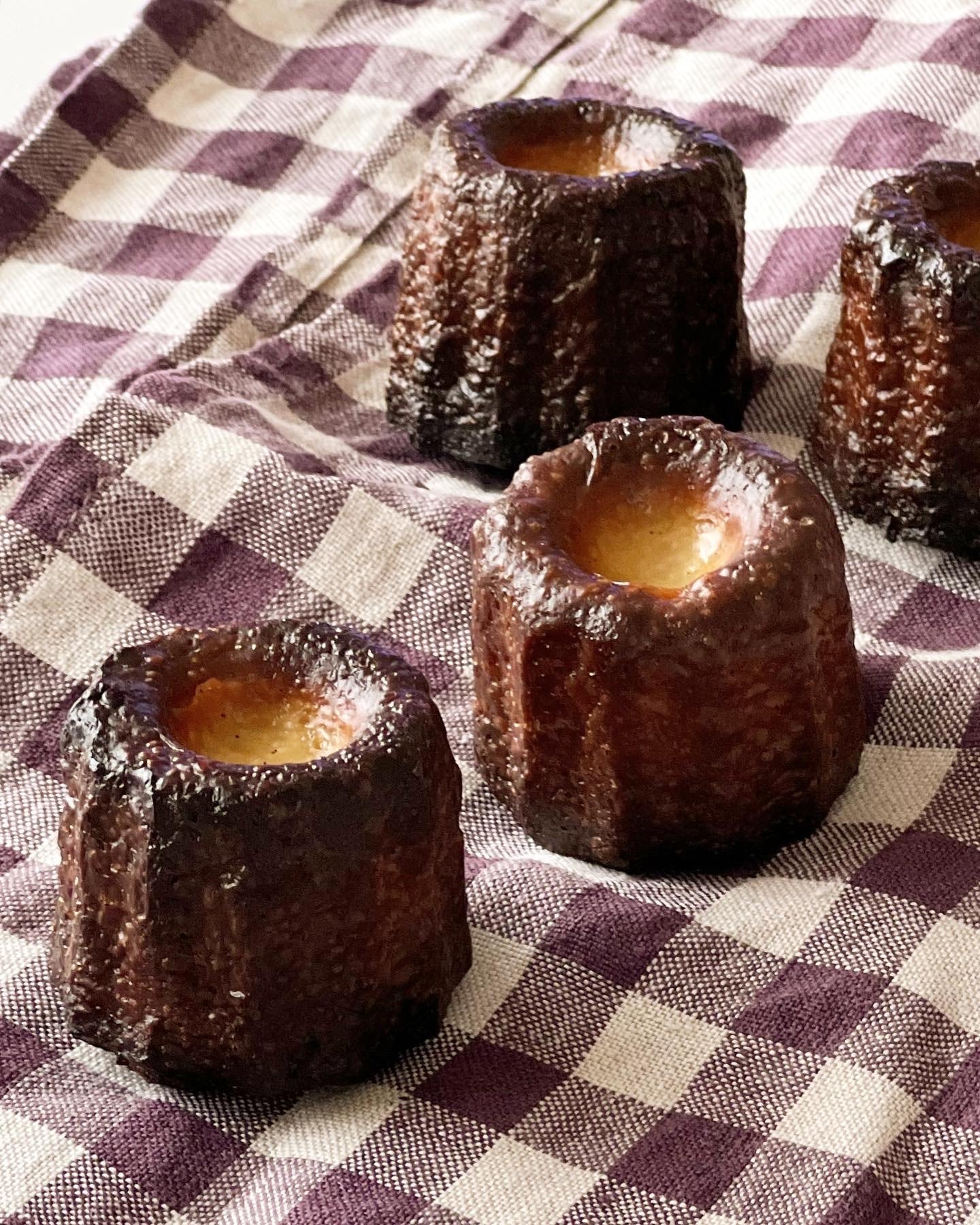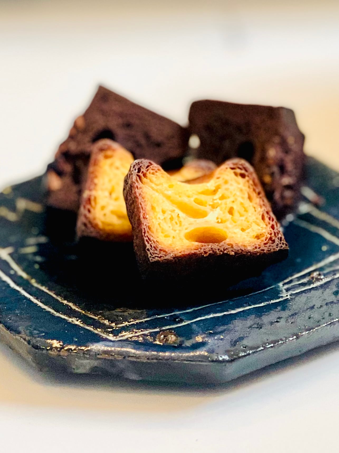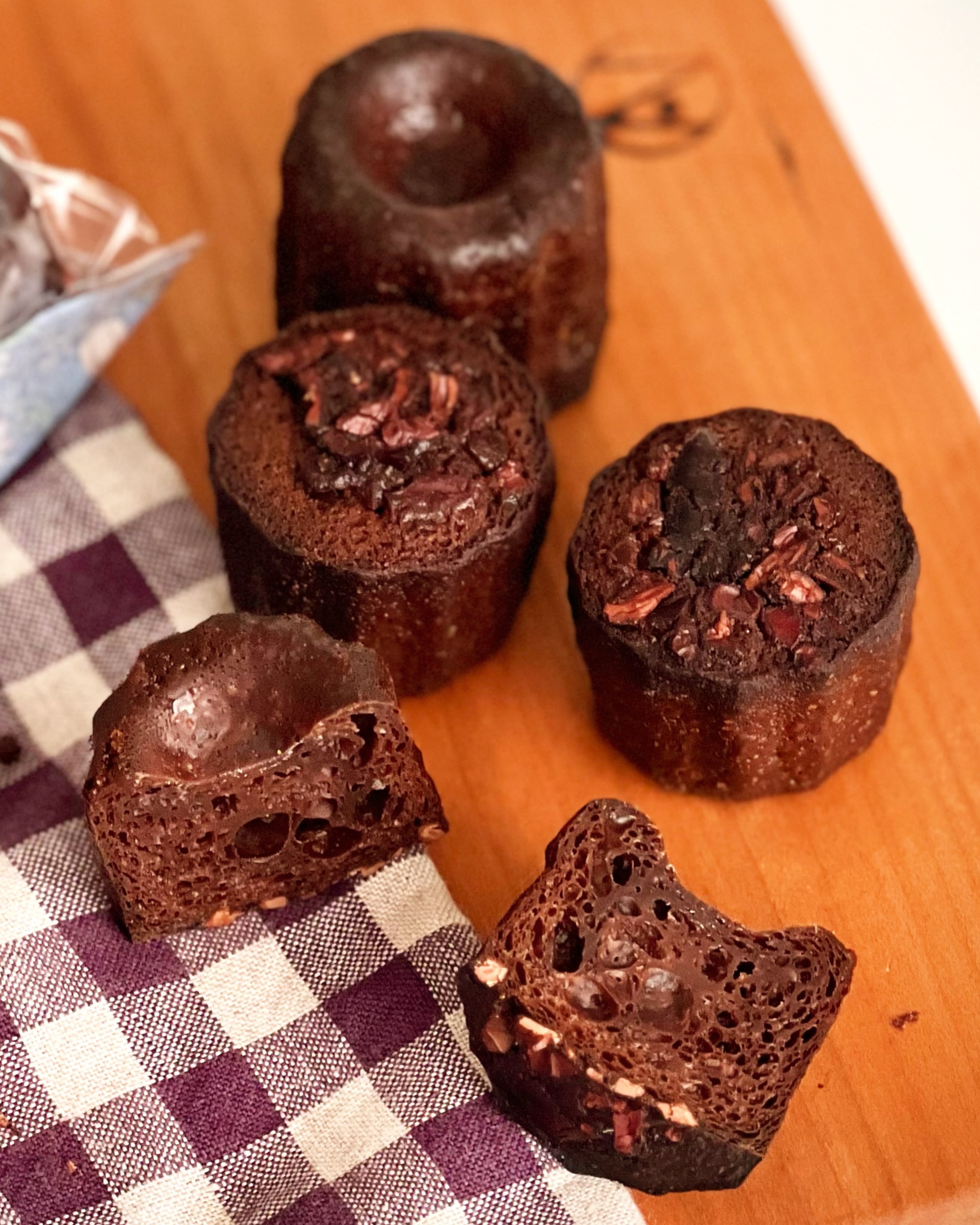 チョコレートを溶かしこんだ生地のカヌレです。カヌレには通常ラム酒をたっぷりと使うのですが、チョコとの相性がよいグランマニエを使っています。チョコとオレンジの香りの組み合わせと、カカオニブのカリッを愉しんでくださいね