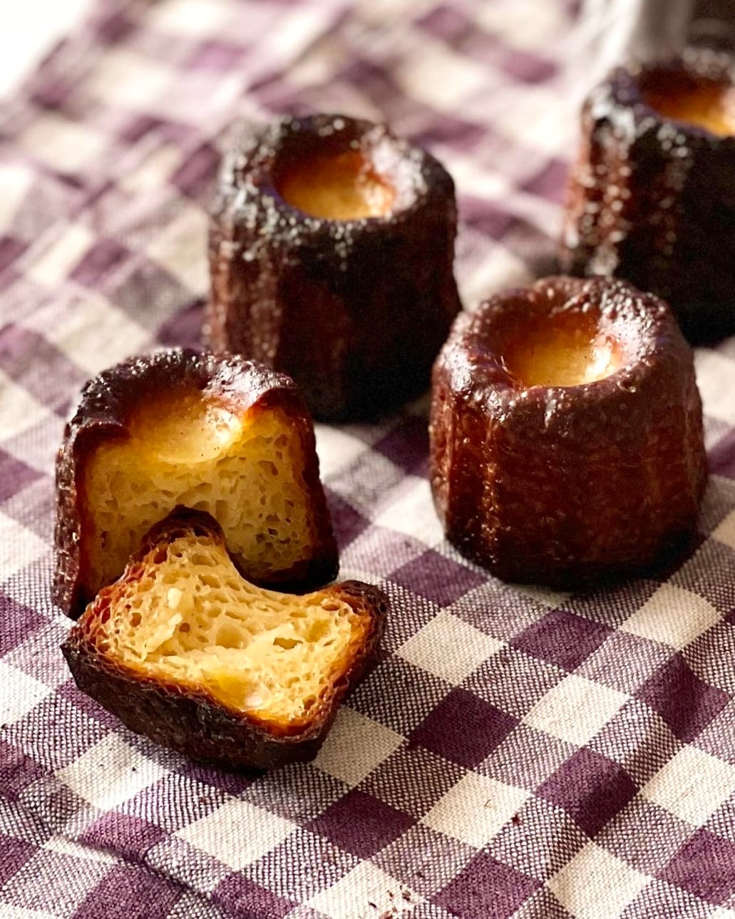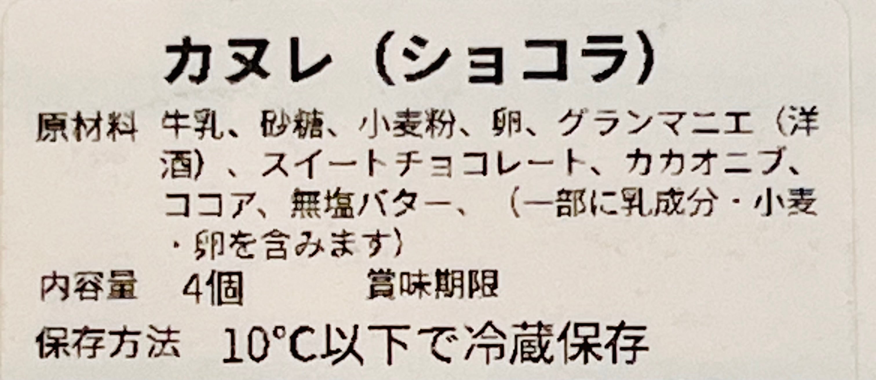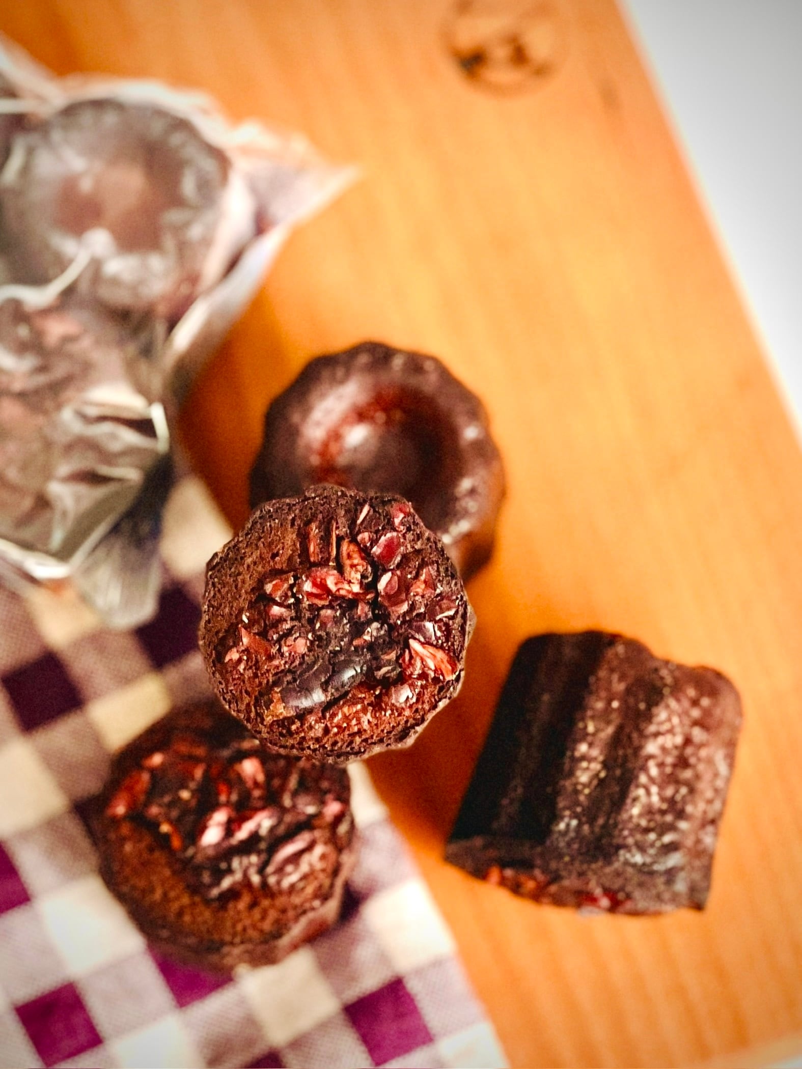 チョコレートを溶かしこんだ生地のカヌレです。カヌレには通常ラム酒をたっぷりと使うのですが、チョコとの相性がよいグランマニエを使っています。チョコとオレンジの香りの組み合わせと、カカオニブのカリッを愉しんでくださいね