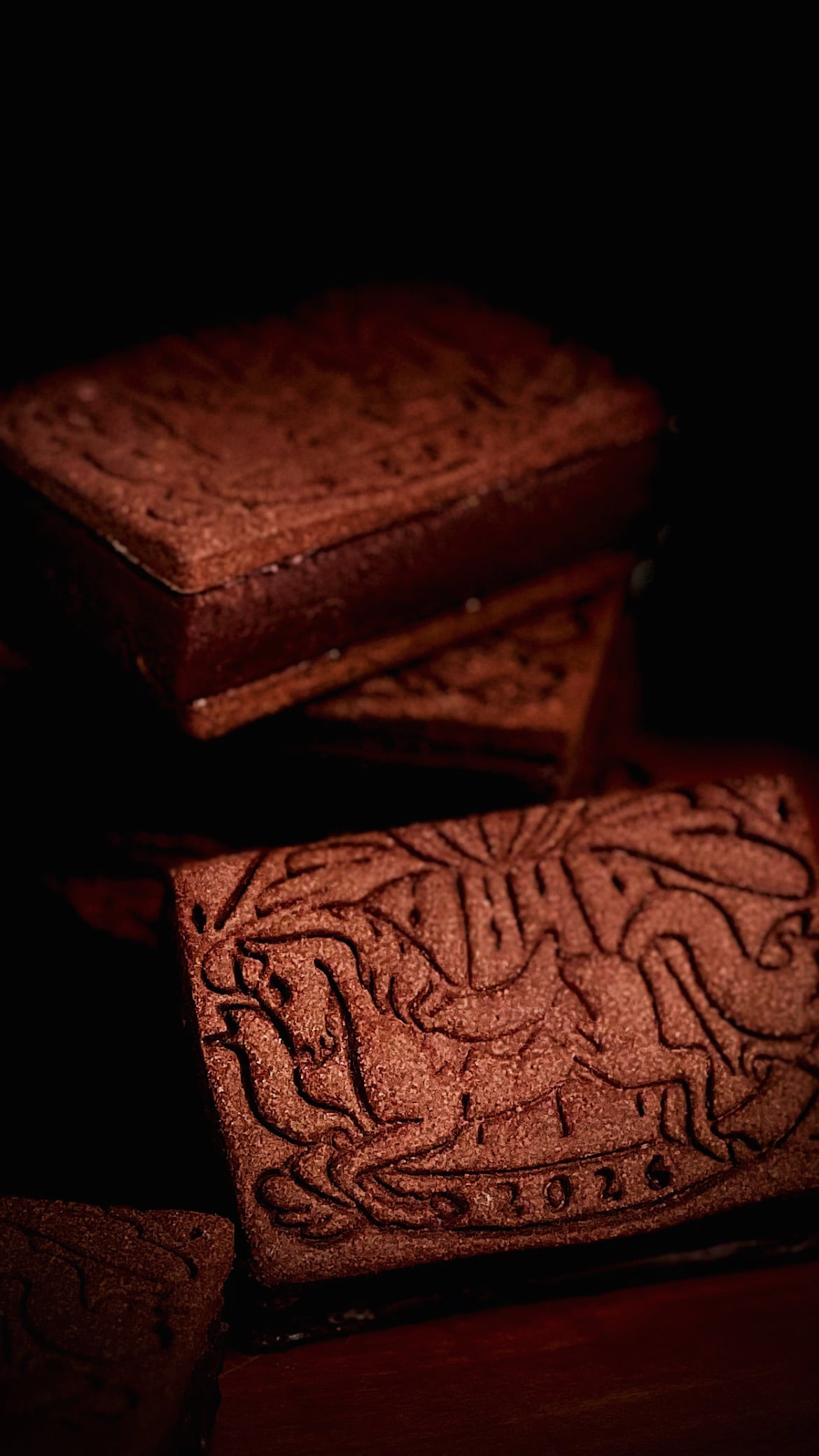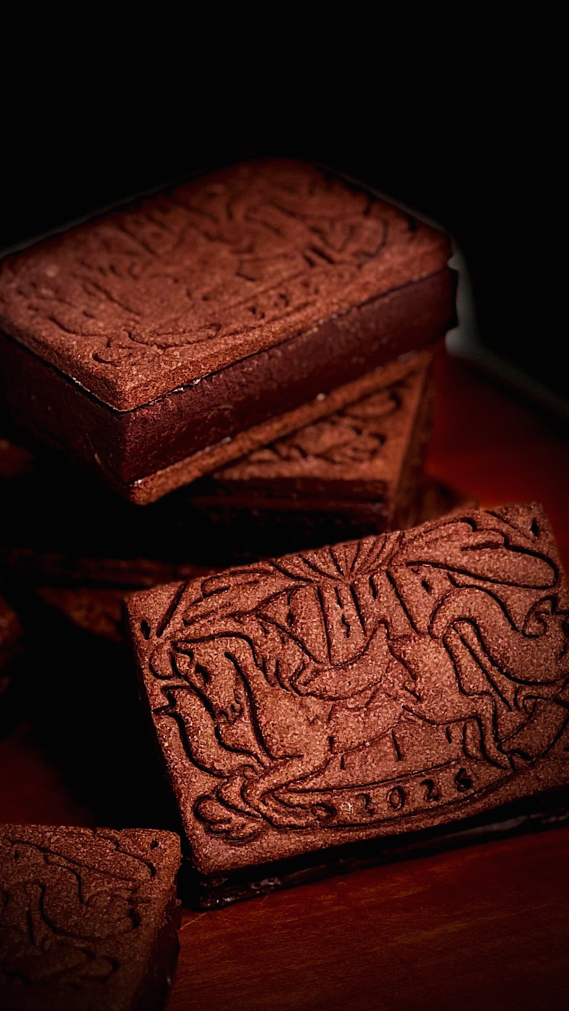 リッチな生チョコレートをカーニバルを連想させる楽しい馬のスタンプを押した、サクサクのココアのクッキーでサンドしました。生チョコはぶ厚くたっぷりのボリュームなので満足感が半端ないですよ!生チョコにはバターも加えているので、ぶ厚くても口溶けはとてもよいですよ。チョコレートはエクアドル産のカカオ70%のダークなものを使っています。エクアドル産は果物のような酸味と花のような香りが特徴で、わたしも大好きなチョコレートです。