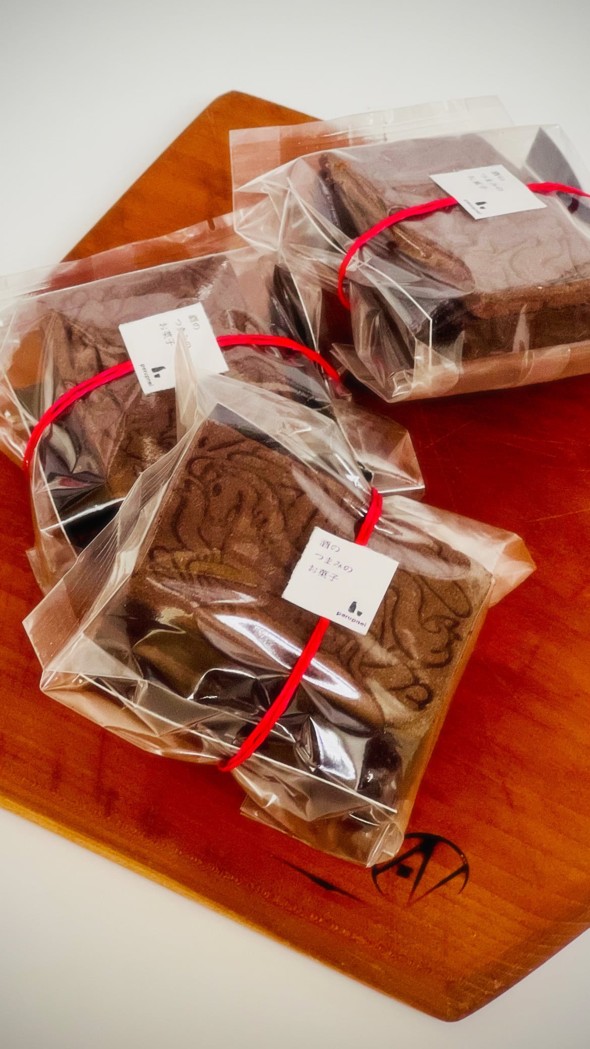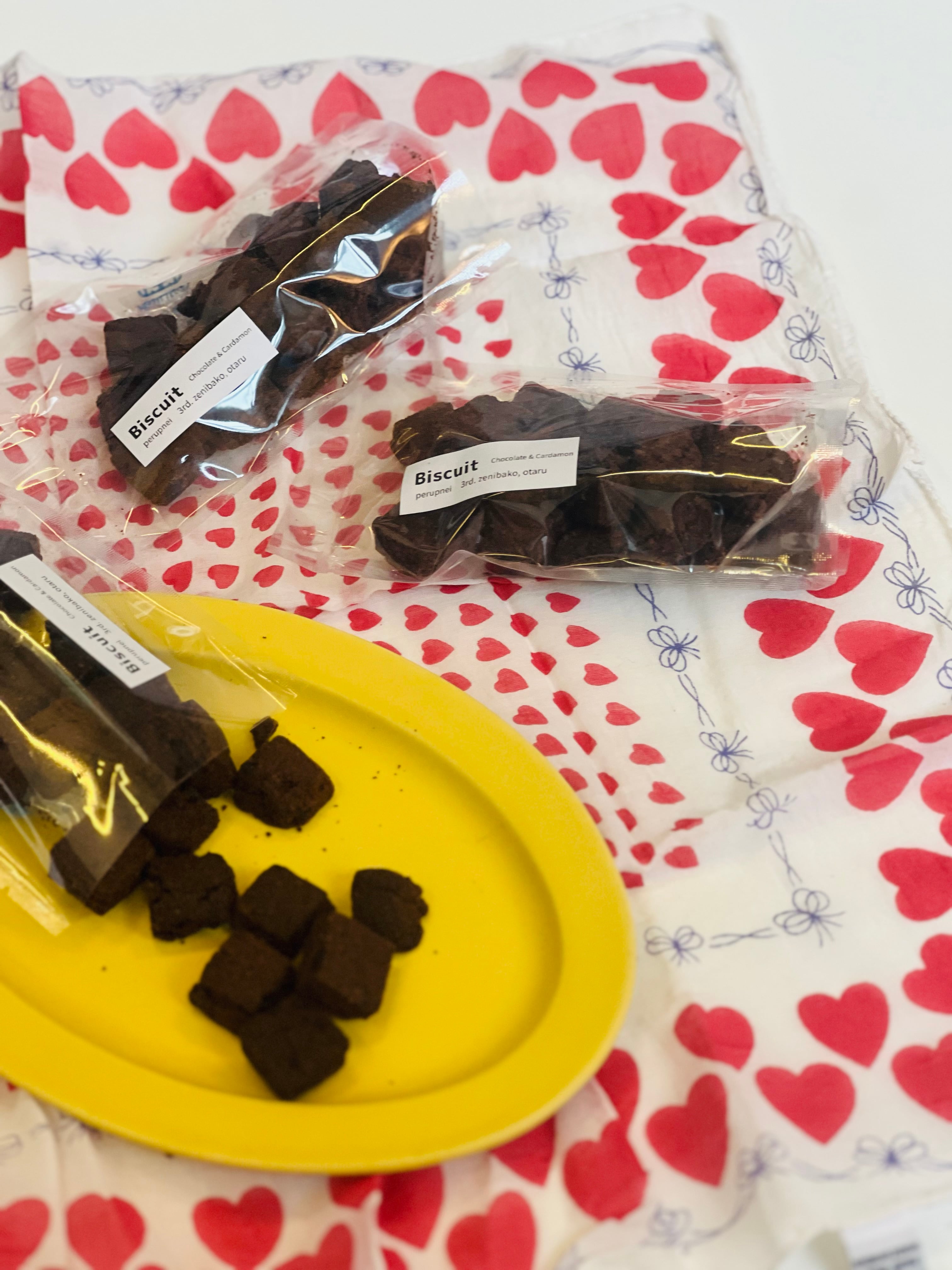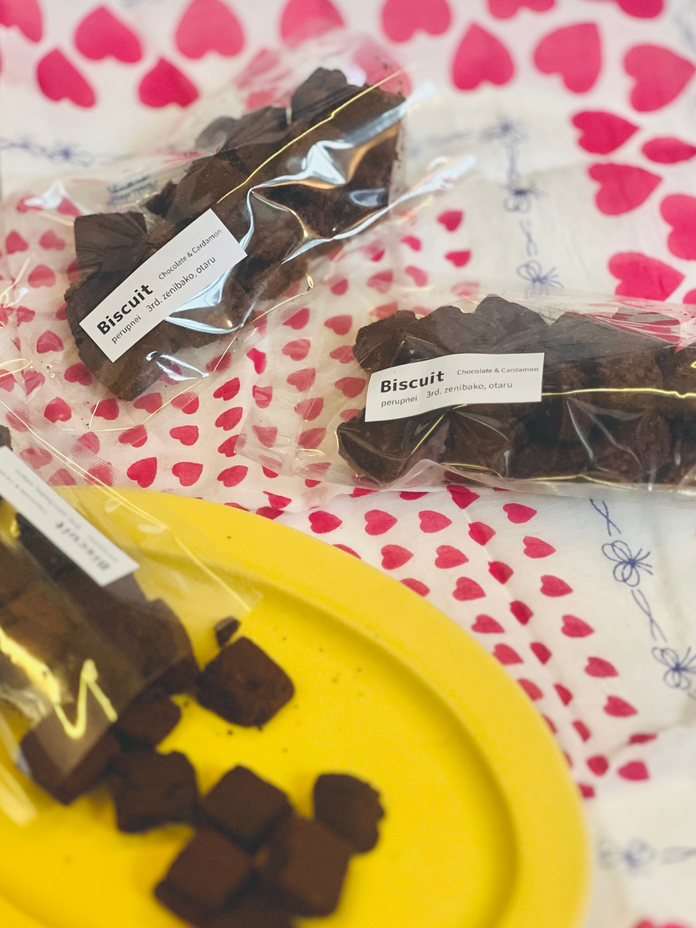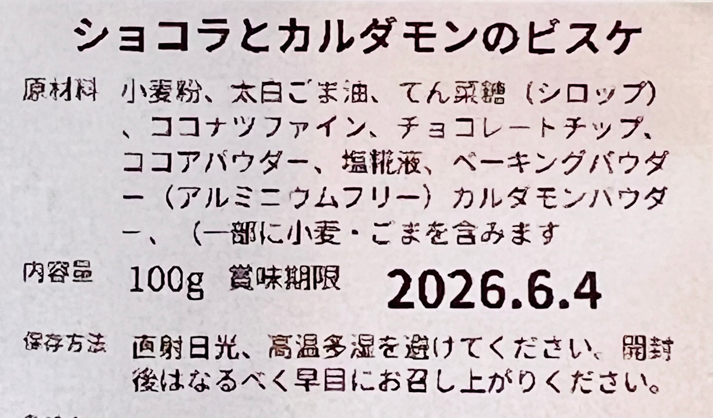 生地にココナツファイン(ココナツを細かく砕いたもの)を加えているので、生地の結束が弱くなって、口解けがよく焼きあがっています。少し苦みのあるココアの生地にカルダモンの爽やかな香りが広がりチョコチップがカリッとします。塩糀を使っているのでもぐもぐ噛んでいると旨味を感じられます。後旨(あとウマ)な味わいのお菓子です。