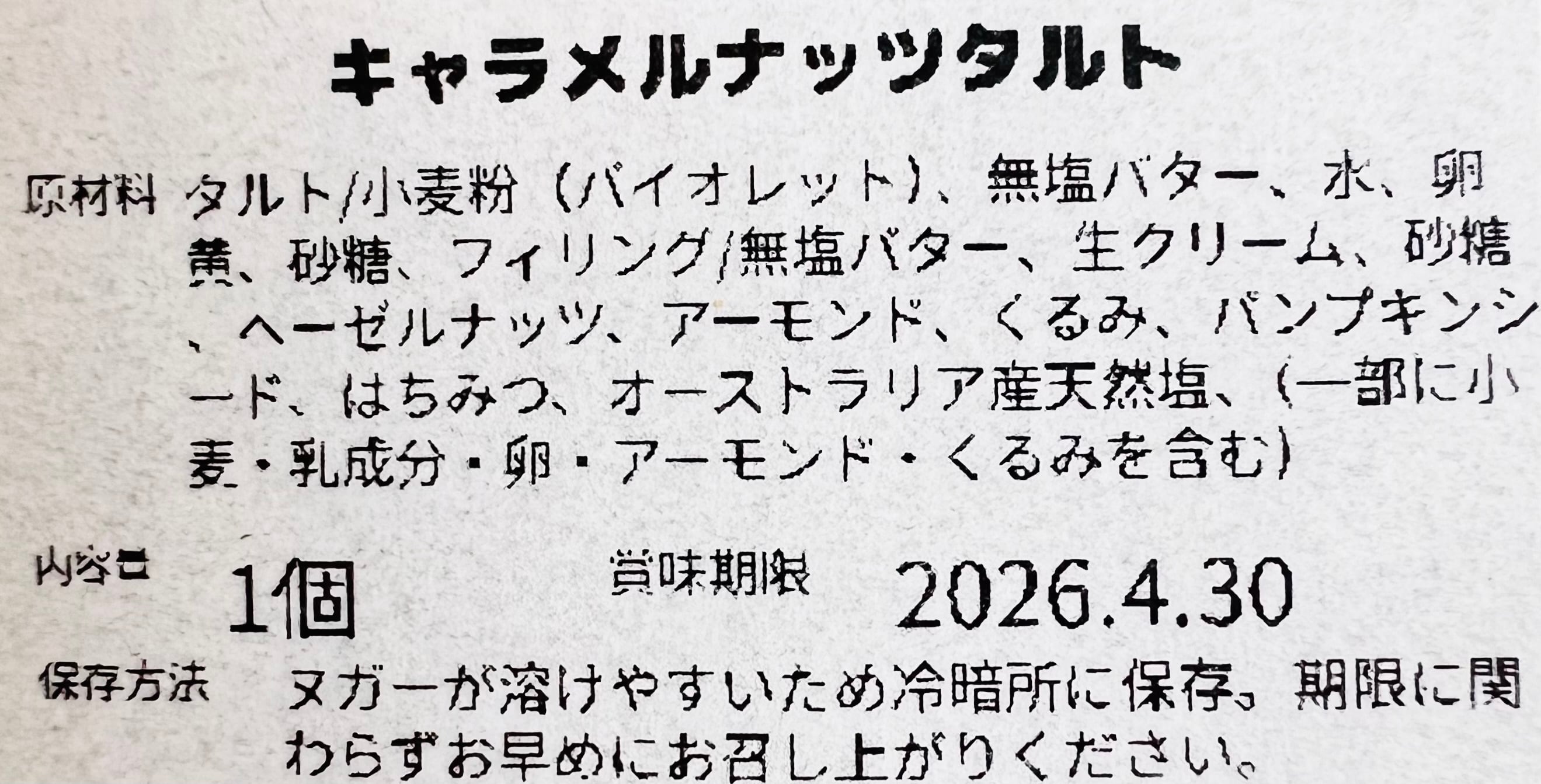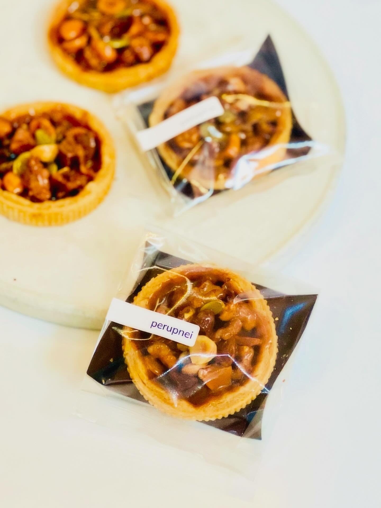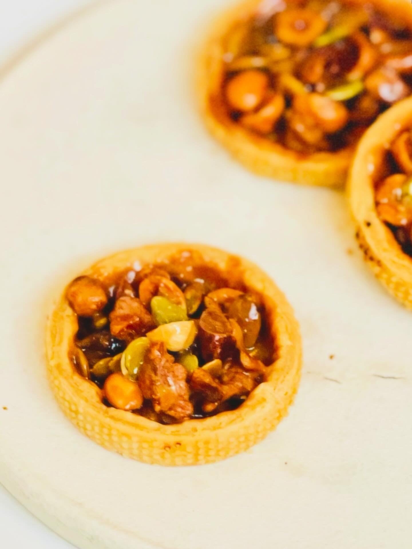 ヘーゼルナッツ、くるみ、アーモンド、パンプキンシードにキャラメルを絡めて、直径8センチのタルト台いっぱいに広げて焼きあげたボリューミーな逸品です。ナッツの複雑な香ばしさとキャラメルのマリアージュをお楽しみくださいませ。