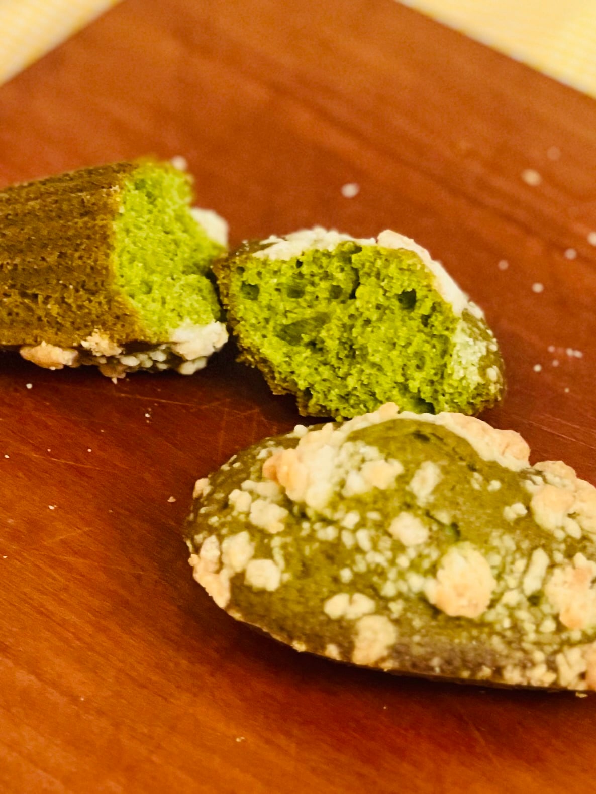 今回は京都産の抹茶、つまり宇治抹茶を使いました。正直いつも使っている抹茶とは別次元の材料で、発色の鮮やかさ、香りの違いに驚きました。ゆえにとんでもなく美味しいです。生地はシンプルに抹茶のみですが、きび砂糖を使いました。コクのある甘さが抹茶に合いました。食感のアクセントにアーモンドクランブルを乗せて焼きあげました。
