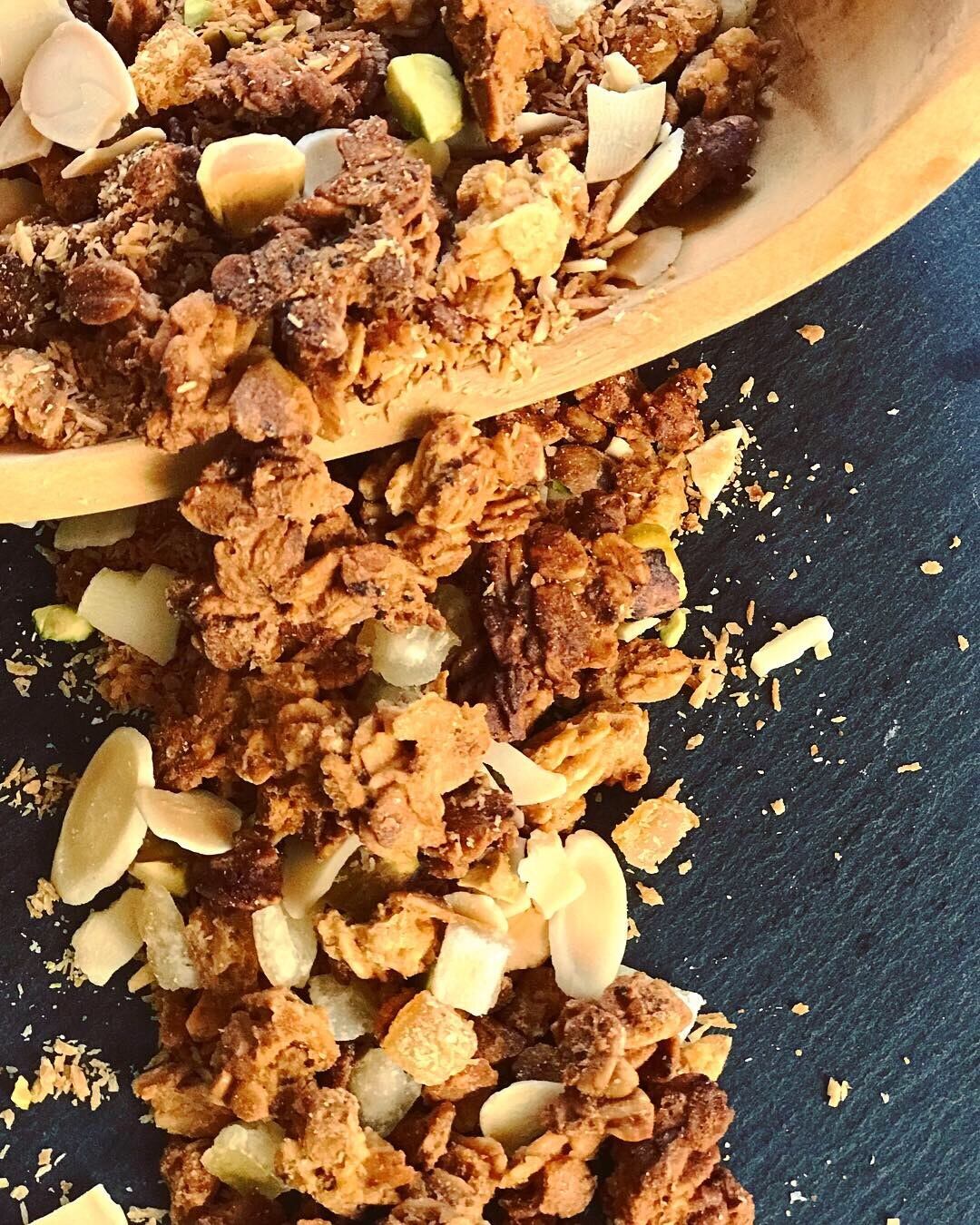 春らしく爽やかなレモンの風味をお楽しみください。こちらも久しぶりの登場ですが、大幅にレシピを改めました。油脂にバターを使ってリッチなコクを出しているのは従来通りですが、今回は自家製のレモンシロップとはちみつを使って甘みとしました。シロップは皮ごとスライスしてお砂糖に漬け込んで作るのですが、レモン果汁を加えるのと違って、よく噛んで味わったとき、果皮の苦みがほんのりと感じられます。これがなんだか春らしく感じられます。具材となるナッツも今回はパンプキンシードではなく、ピスタチオナッツを使い目に爽やかなグリーンとミルキーな味わいを加えました。ココナツは細かいファインを使っています。細かいのでお口に入りやすいと思いますが、袋や容器の中で生地と離れて底に沈んでしまうと思います。お手間でなければ、保存は広口のちょっと大きめの瓶に移して、スプーンでひと混ぜしてから取り出すと生地にまんべんなく絡んで食べられると思います。ヨーグルトやバニラアイスに合いそうですね。追いはちみつをして食べても美味しそうですよ。
