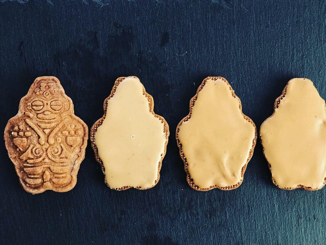 サクサクの仕上がりゆえ、配送中に割れないよう、補強をかねて土偶さんの裏面に、アイシングを施しています。アイシングには甘過ぎないように自家製コーヒーリキュールを加えて甘さを抑えました。