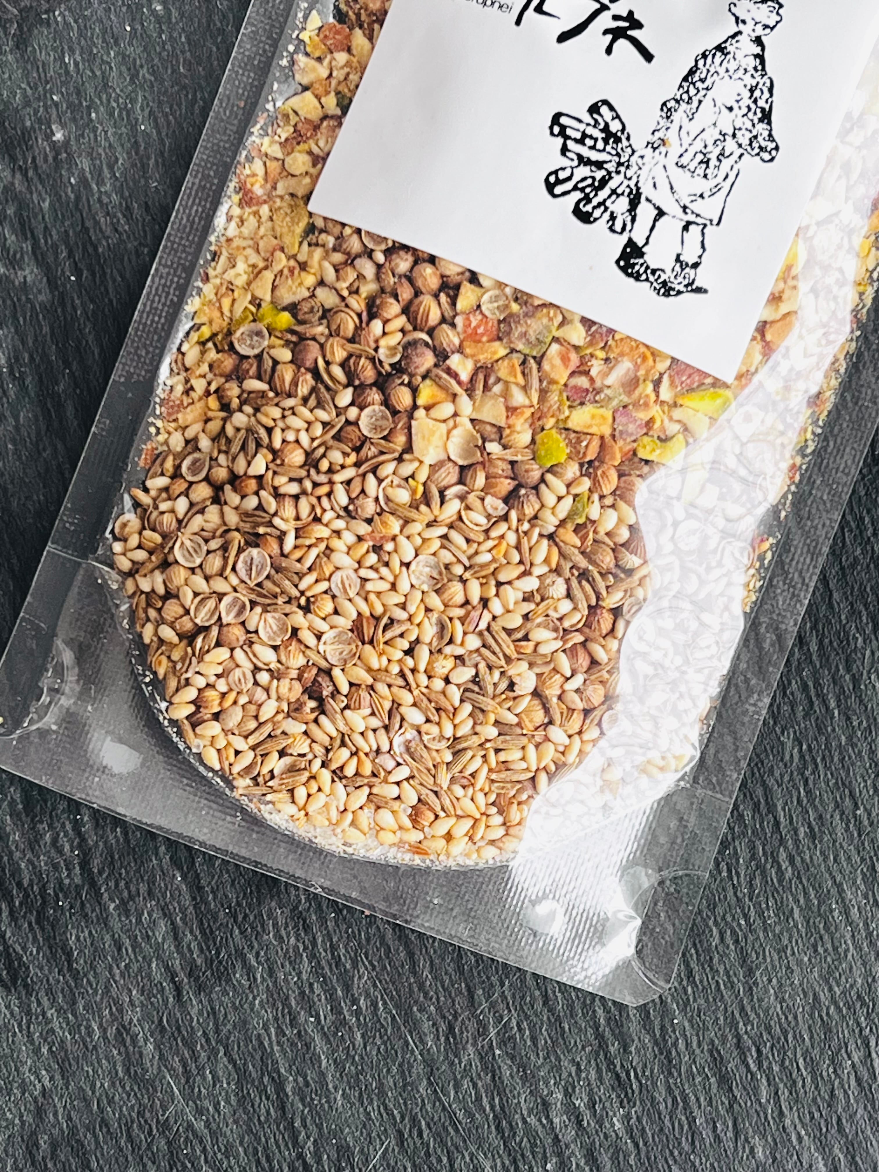 クミンシード、コリアンダーシード、ごまをベースに塩を合わせています。