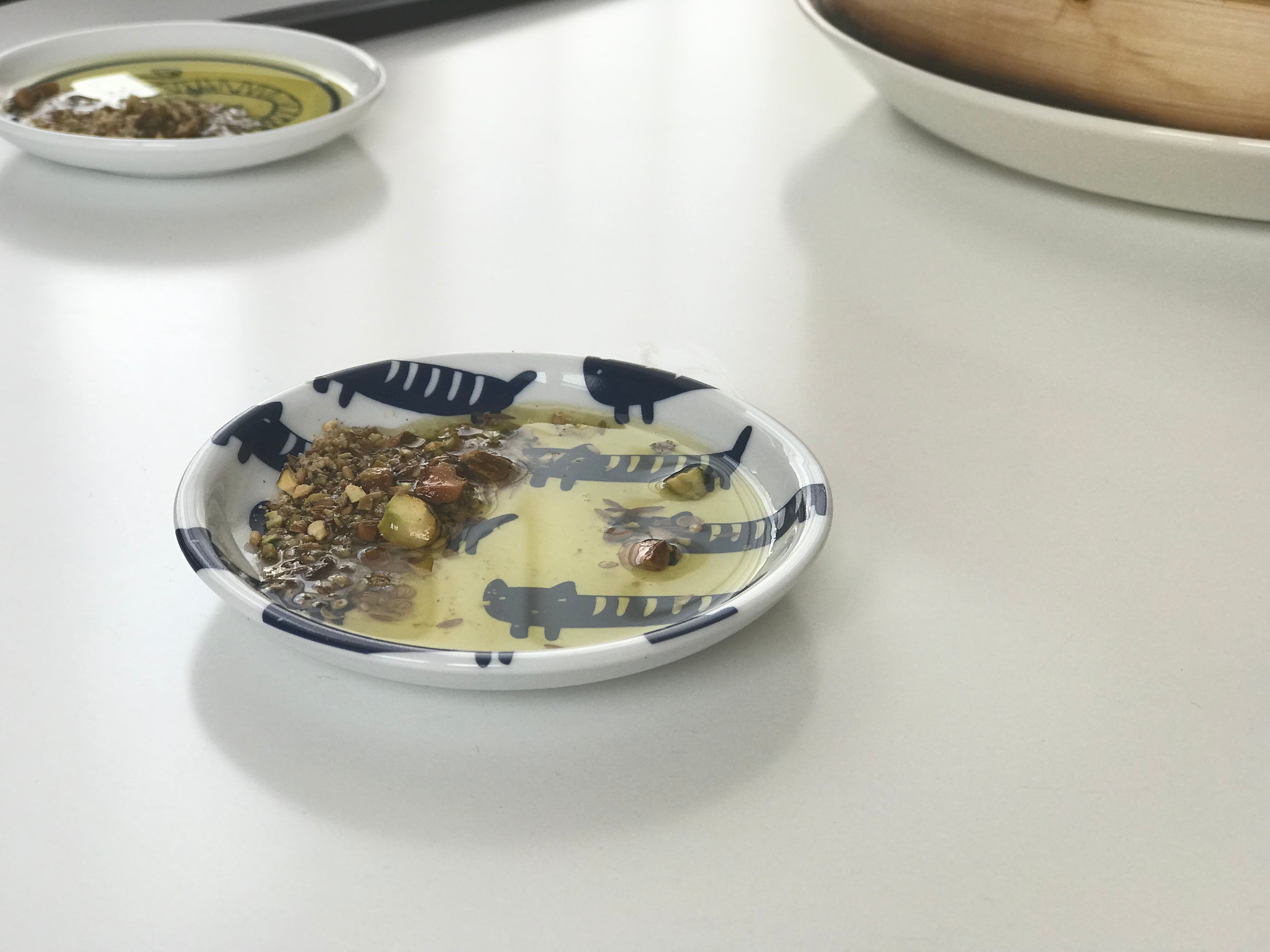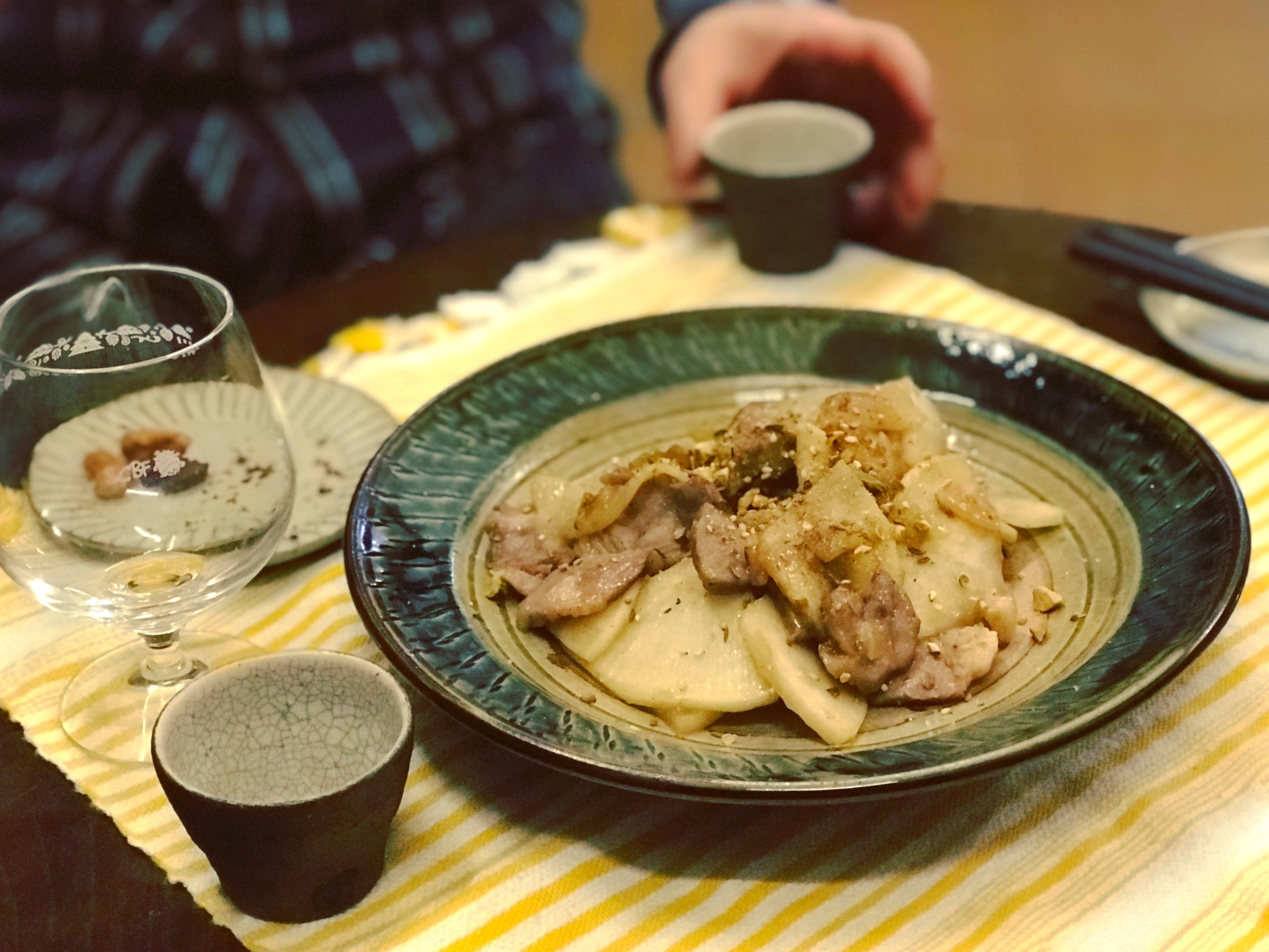 写真の料理は塩豚と聖護院大根を炒め合わせて、『ピスタチオのデュカ』をふりかけました。