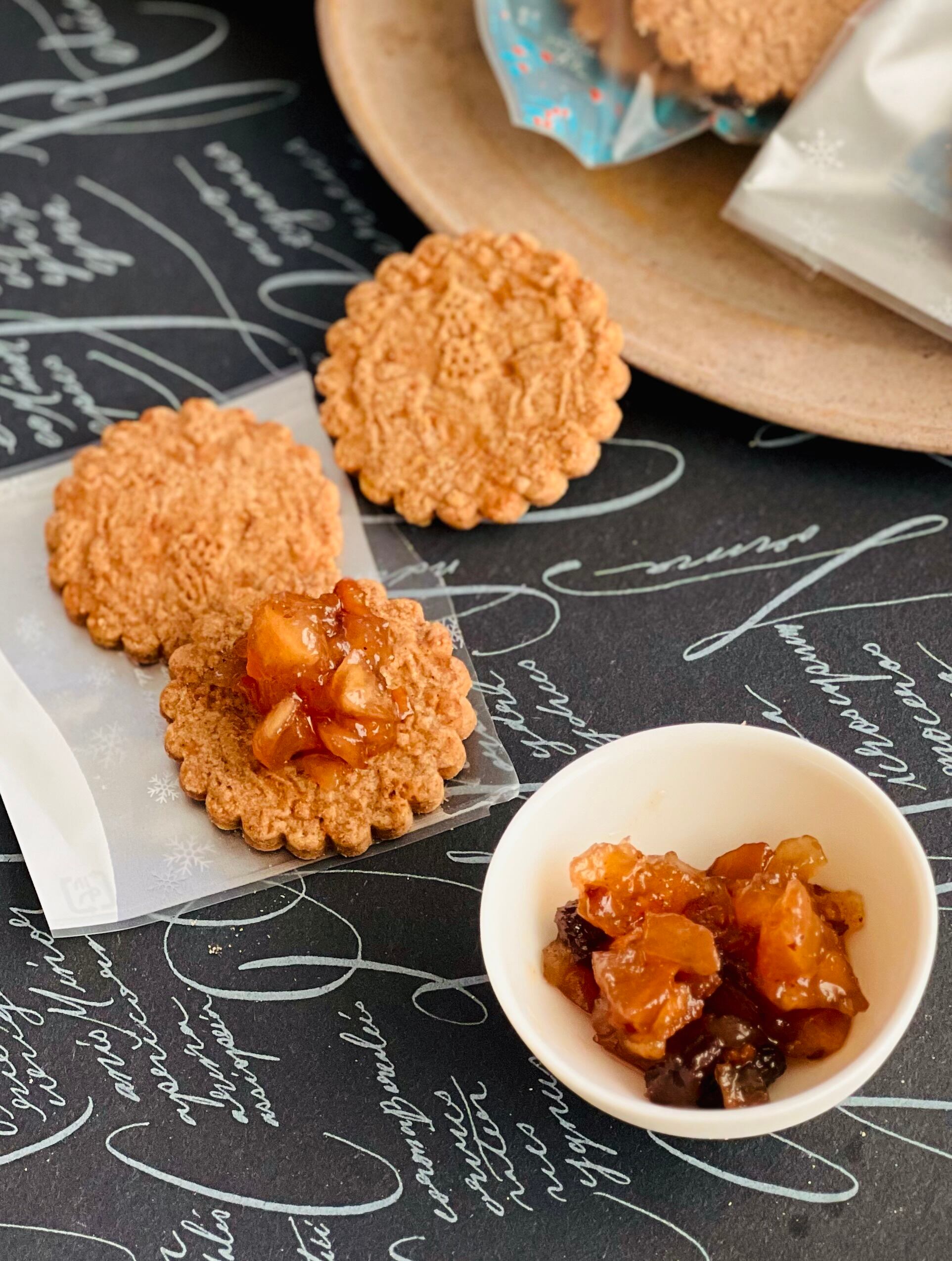 スペキュロスというヨーロッパの伝統的なミックススパイスを自家配合して、ほろサクな焼きあがりになる生地に加えました。トナカイのスタンプでクリスマスらしさを演出しました。待ちきれないですね。ぜひ同梱のコンフィチュールとご一緒にお召し上がりくださいませ。