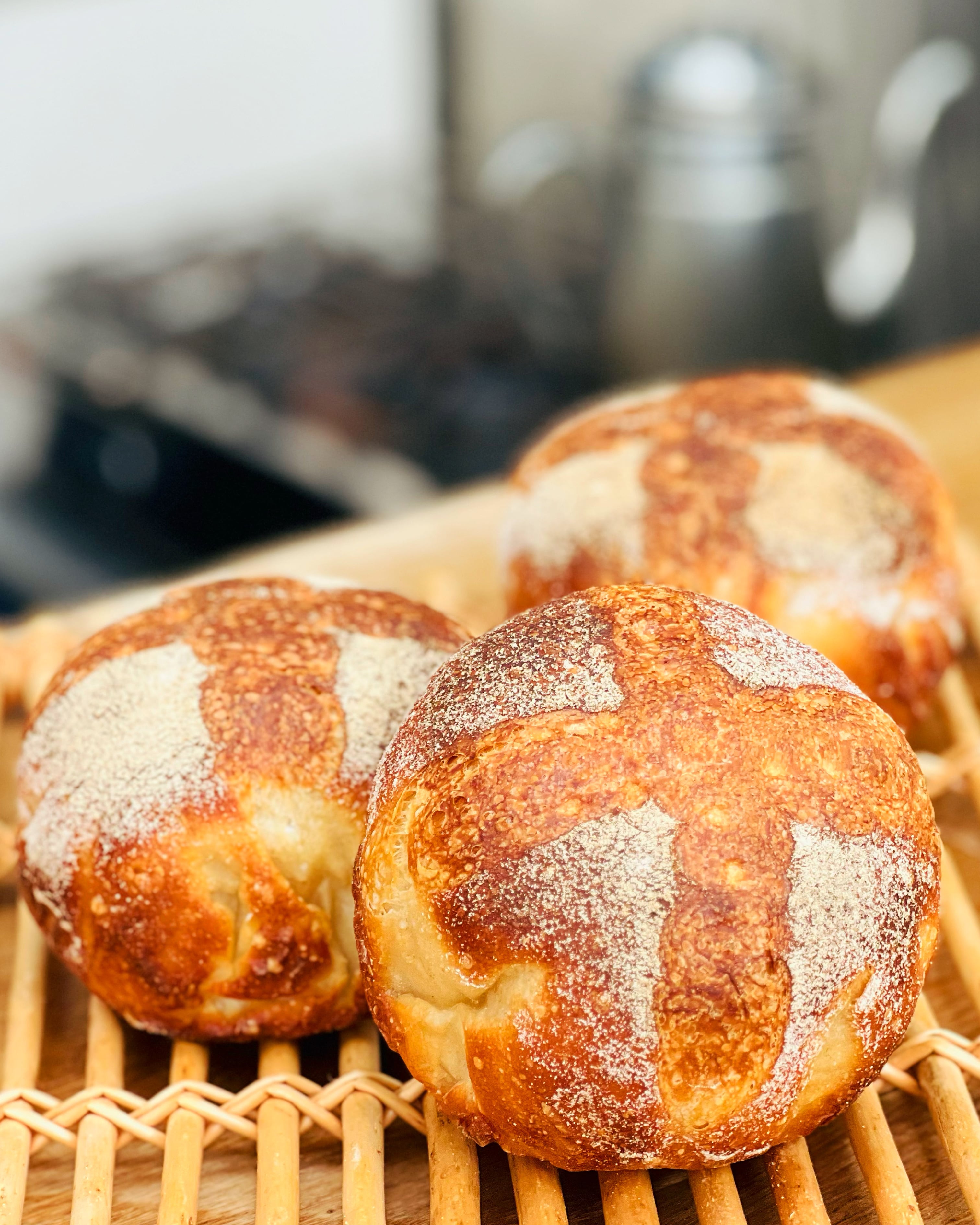 このお鍋を使うことで生地の加水率を高めることができ、皮(クラスト)が薄くカリッと、中身(クラム)がしっとりもちもちとして、気泡がポコポコと入ったボリューミーで絶品のカンパーニュが焼きあがります(パンの断面の写真は同じレシピで焼いた大きなカンパーニュの断面です)
